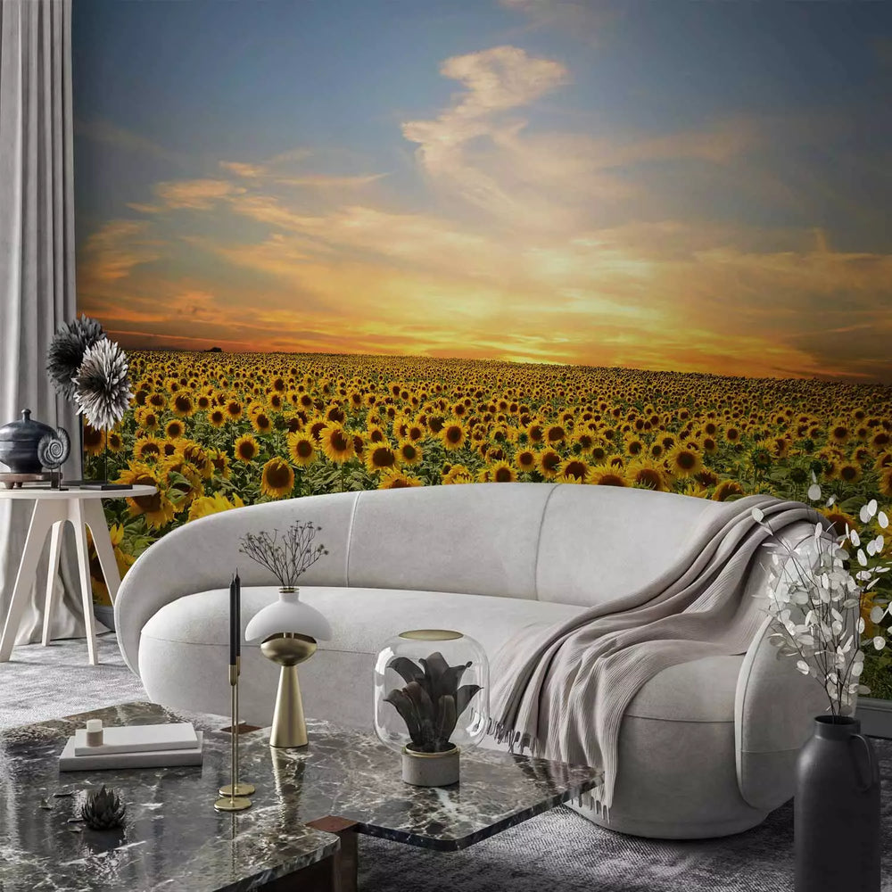Fototapetes - Saulespuķu lauks saullēktā, 136314