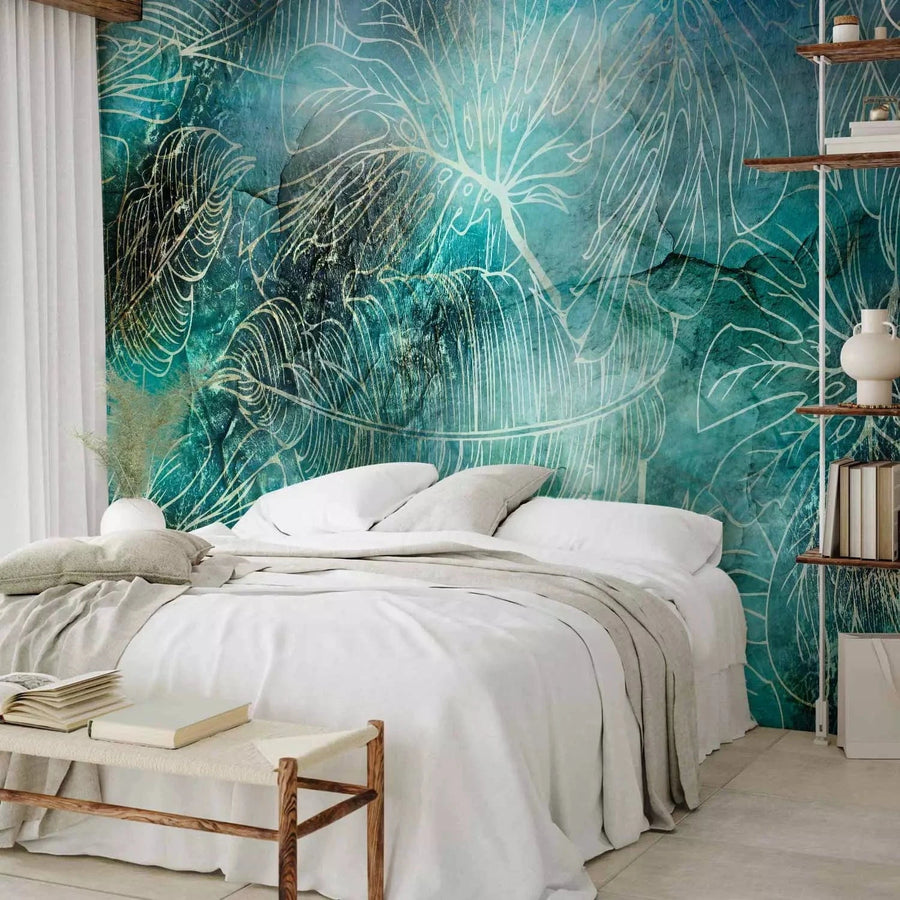 Fototapetes - Zelta lapu kontūri uz tirkīza fona - piemērs interjerā G-ART