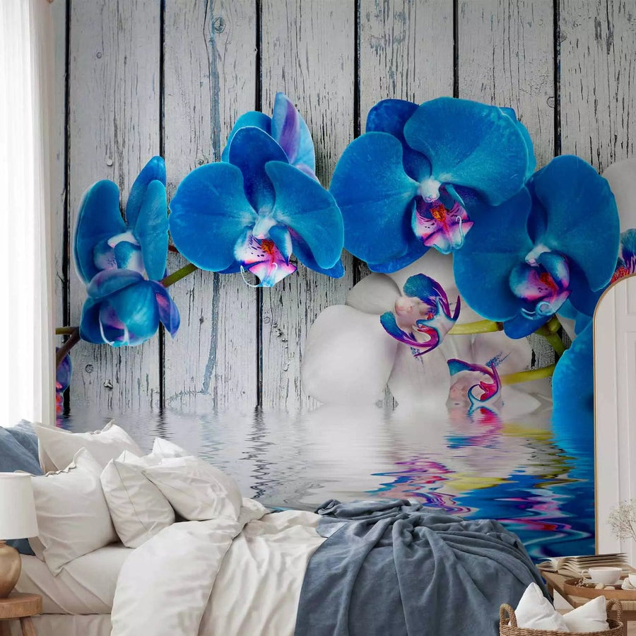 ototapetes ar orhidejam zilā krāsā un koka dēļiem pelēkā krāsā, 60238 G-ART