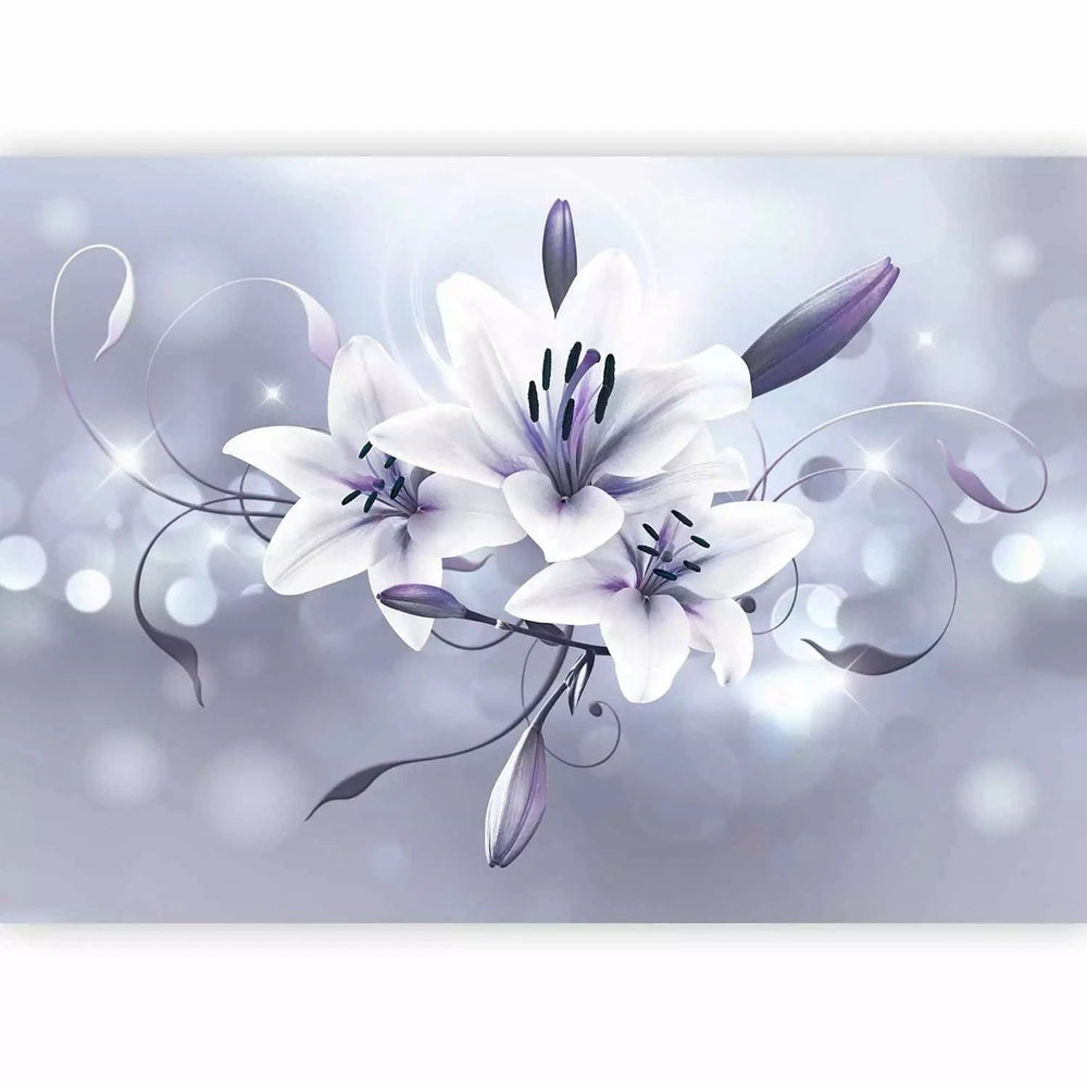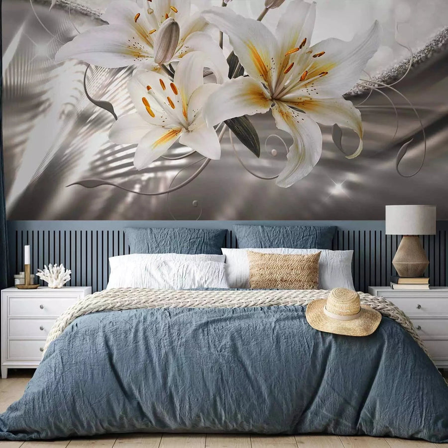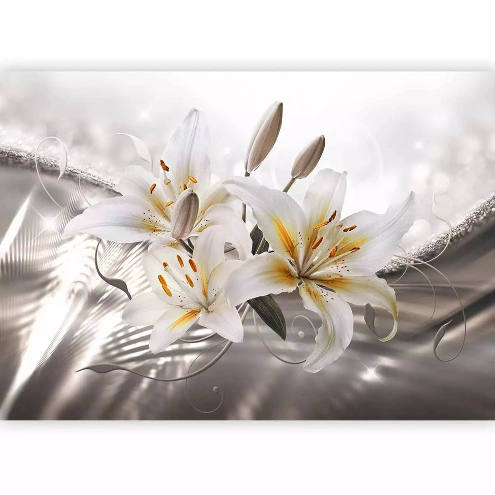 Fototapetes - baltas lilijas uz sudraba fona ar vieglu mirdzuma efektu G-ART