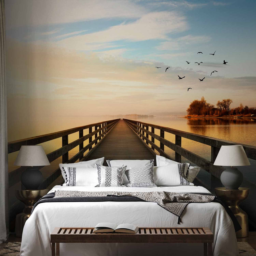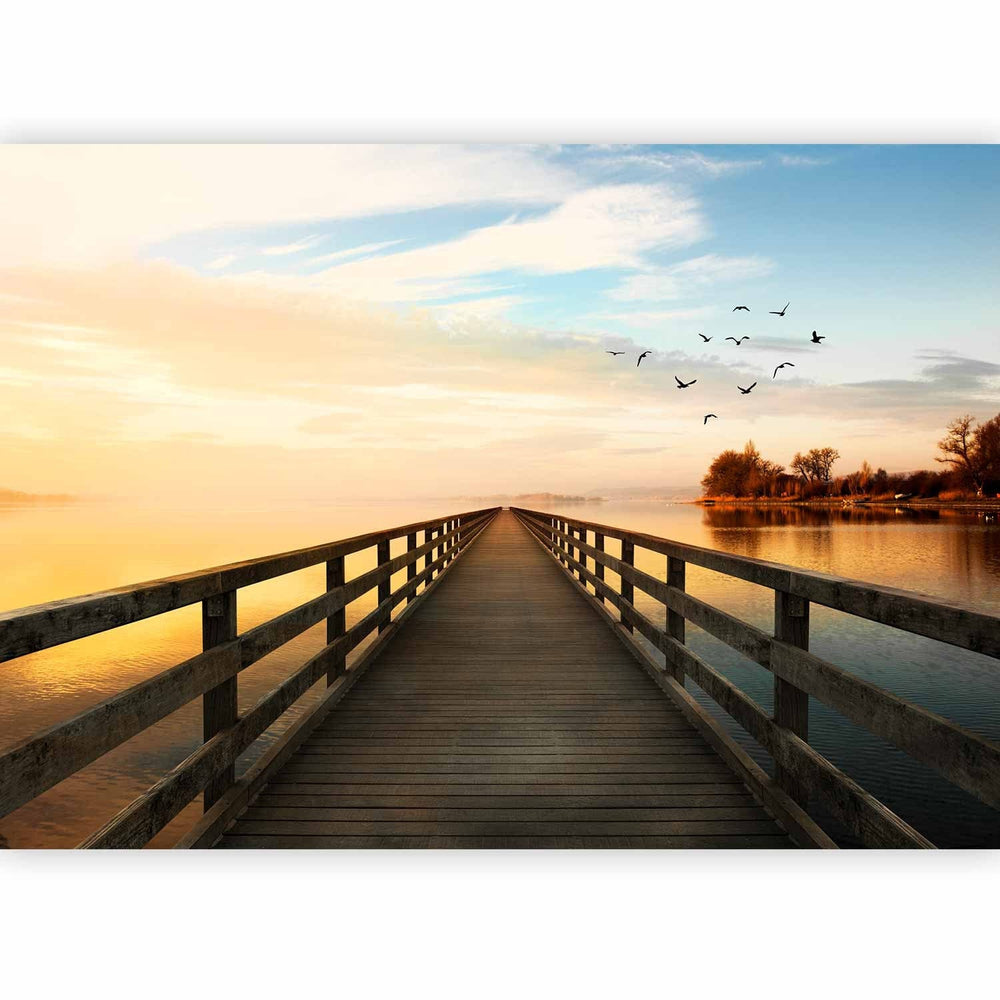 Fototapetes - tilts pār mierīgu ezeru, ko ieskauj putni un koki G-ART