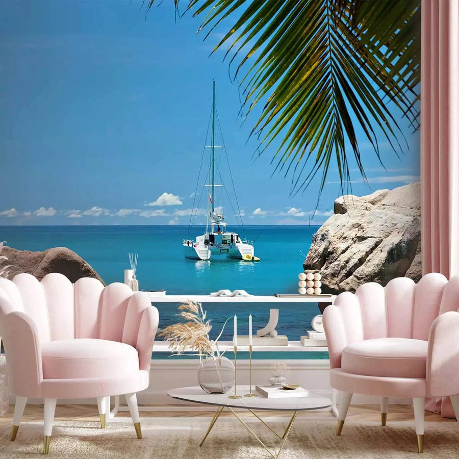 Fototapetes - Skats no loga uz salu un klinšainu līci, 62447