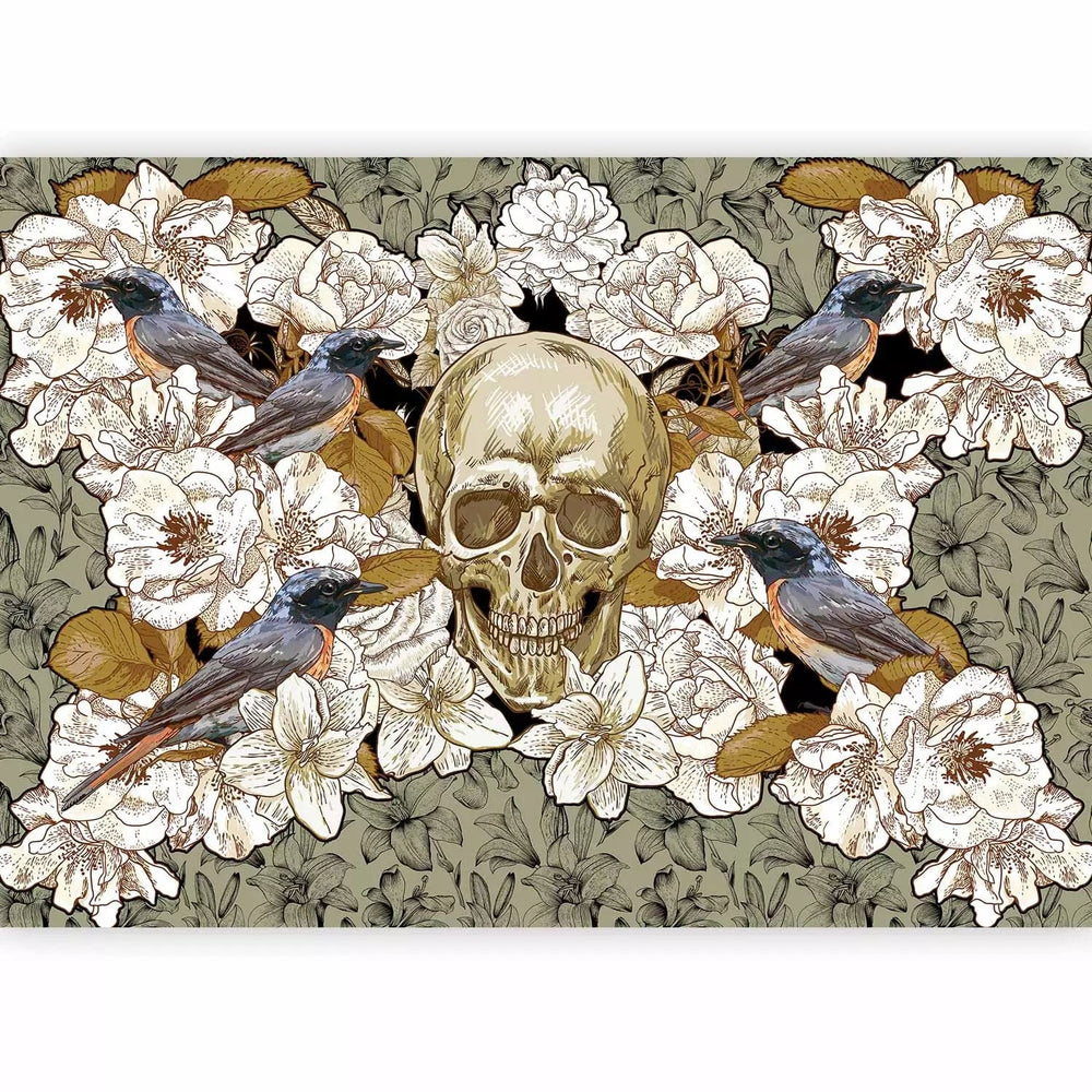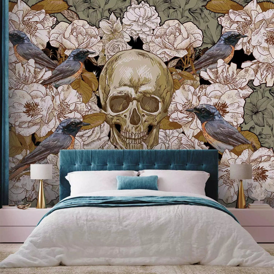 Fototapetes, fantāzijas motīvs ar putniem un galvaskausu uz ziedu fona G-ART