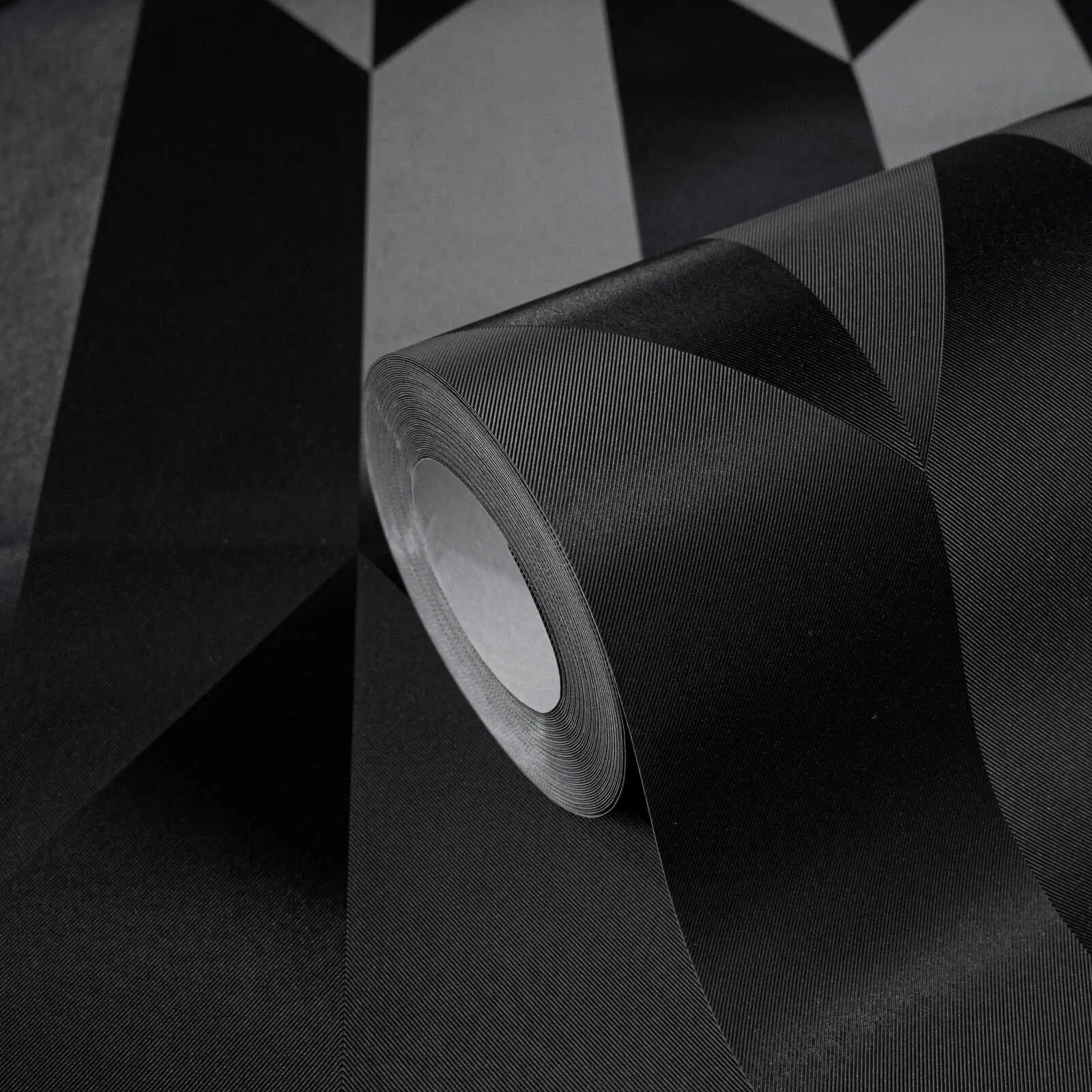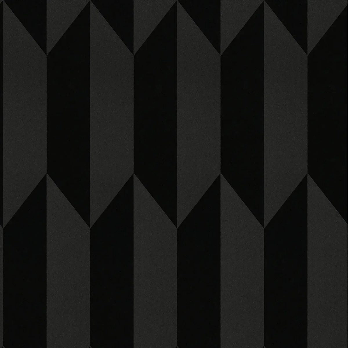 Tapešu raksts sastāv no stingri ģeometriska rombu un paralēlogrammu izkārtojuma, kas atkārtojas vertikāli. Katra sekcija sastāv no dažādiem melnā un antracīta toņiem, kas rada smalku 3D efektu, mainot virsmu izkārtojumu: rodas iespaids par malām un krokām, it kā virsmas būtu salocītas trīsdimensiju veidā. Krāsas ir tikai tumšā spektrā, radot elegantu, izsmalcinātu un modernu atmosfēru. Šis stils izskatās skaidrs, minimālistisks un atturīgs, bet vienlaikus izceļ grafisko rakstu, izmantojot gaismas un ēnu spēli. Efekts ir gan grezns, gan avangardisks – ideāla izvēle telpām, kurās vēlams izteikts dziļuma efekts un nedaudz ekstravagances.