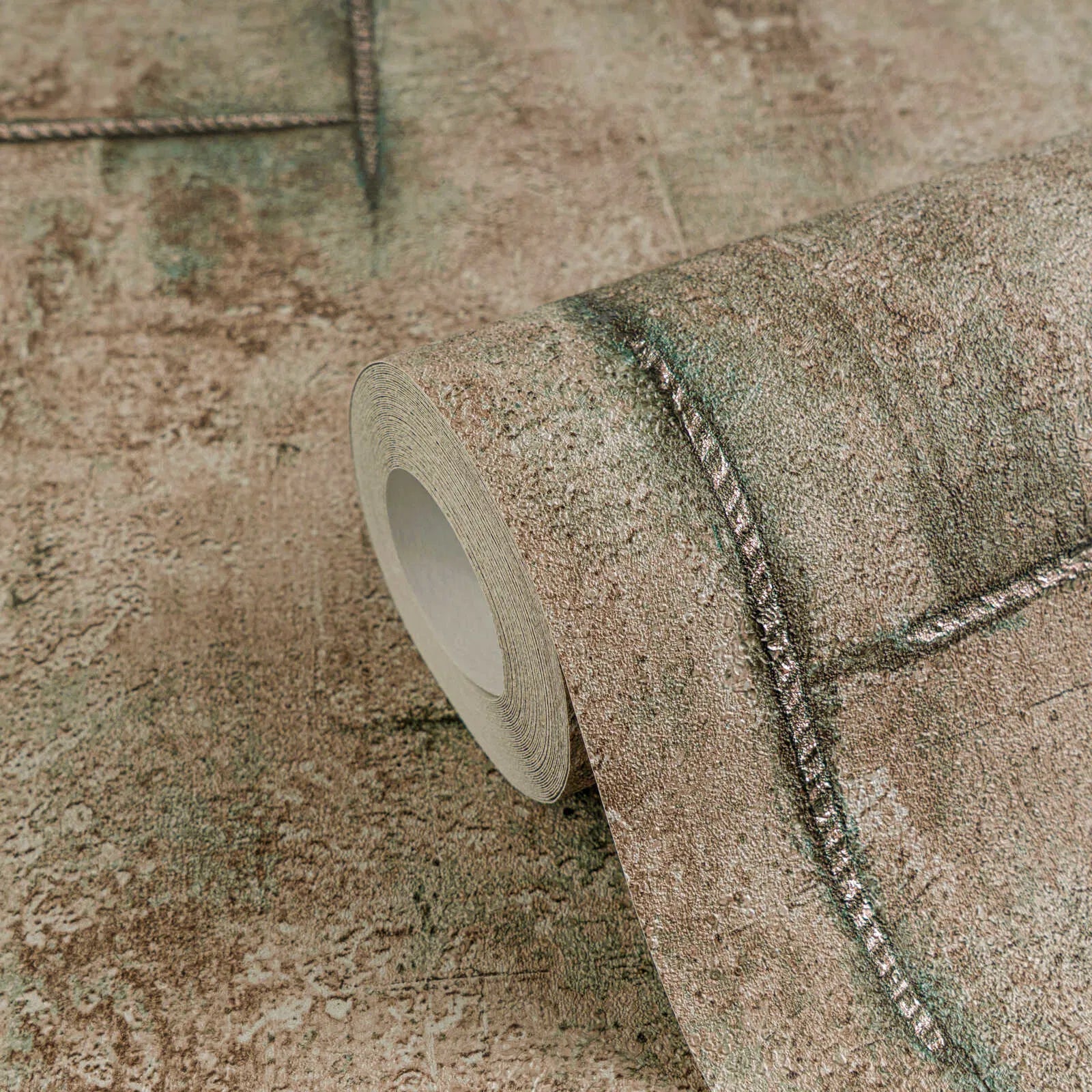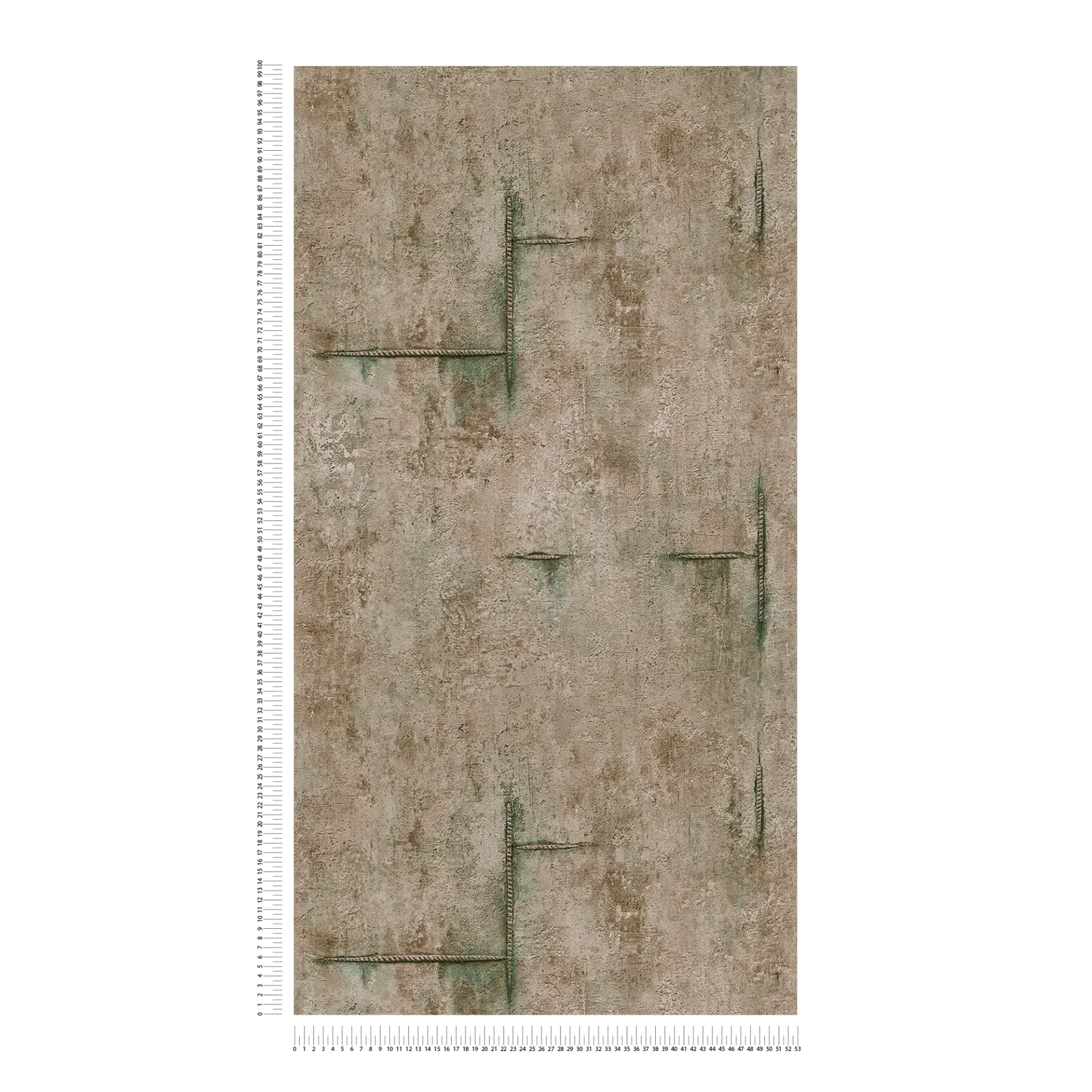 Šo tapetu motīvs atgādina raupju betona virsmu, kas vietām izskatās nolietota un izbalējusi. Pamattons ir zemes krāsas, smilškrāsas pelēkbrūns ar izkliedētām, delikātām balto baložu pelēkā un nedaudz zaļgani zilo toņu niansēm, kas rakstam piešķir patinas pieskaņu. Izolētas ar rūsas izskatu pastiprinājuma stieņi sadala divdimensionālo telpu un piešķir mērķtiecīgus akcentus. Virsmā redzama struktūra un raupjums, tā izskatās gandrīz trīsdimensiju, it kā uzklātas dažādas materiāla kārtas. Stils ir industriāls un urbāns, ar nelielu vintage raksturu. Kopumā krāsa un forma rada neapstrādātu, autentisku atmosfēru, kas ir gan vēsa, gan neparasta, ideāli piemērota modernam loftam vai industriālai videi.