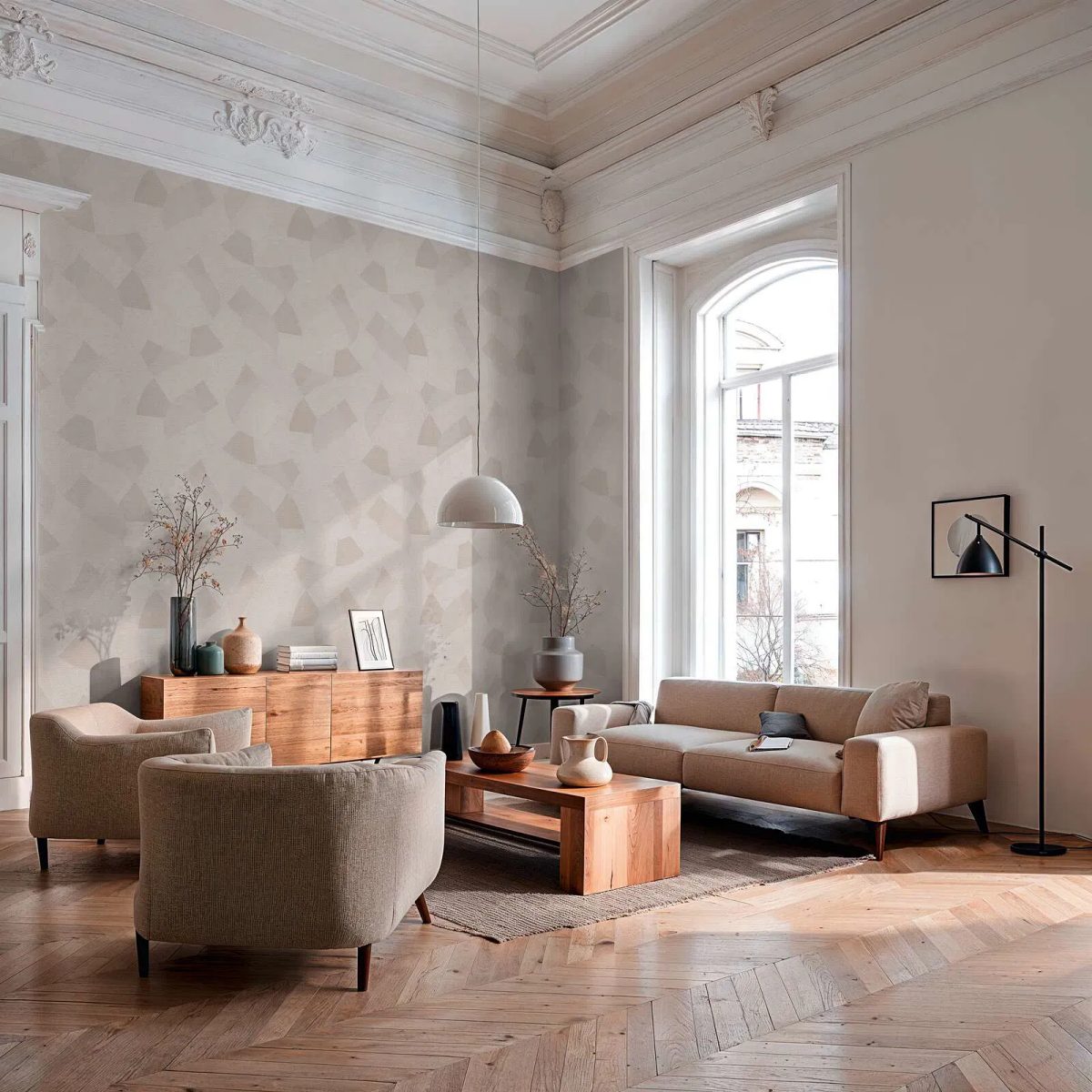 Izsmalcinātas tapetes ar nedaudz spīdīgu virsmu, kas telpai piešķir mūsdienīgu eleganci. Tās ir noturīgas pret skrāpējumiem un viegli tīrāmas no netīrumiem. Uzklājot paneļus ar 64 cm raksta soli taisnā līnijā, tiek panākts vienmērīgs sienas pārklājums. Silti pelēkais tonis ir ideāls fons modernam interjeram – tas ir neitrāls, bet ar raksturu. Ģeometriskie segmenti un smalkās līniju struktūras uz pelēkā fona rada vizuālu dinamiku, nepadarot telpu nemierīgu. Spīduma un matēto līniju mijiedarbība piešķir sienām dziļumu.