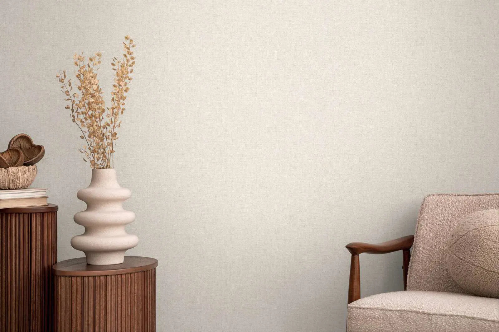 Tapetēm ir atturīgs, ļoti smalks auduma raksts, kas atgādina dabiskas lina tekstūras. Krāsu gamā dominē patīkams, gaiši smilškrāsas toņs, kas rada ļoti neitrālu un siltu efektu. Delikātā tekstūra piešķir virsmai smalku dzīvīgumu, neuzbāzoties. Neuzbāzīgais dizains rada mieru un pieticību, padara telpas draudzīgākas un ar smilškrāsas toņiem rada harmonisku un aicinošu atmosfēru. Ideāli piemērots mūžīgam, minimālistiskam interjeram, kas uzsver delikātas struktūras un maigu gaismas spēli.