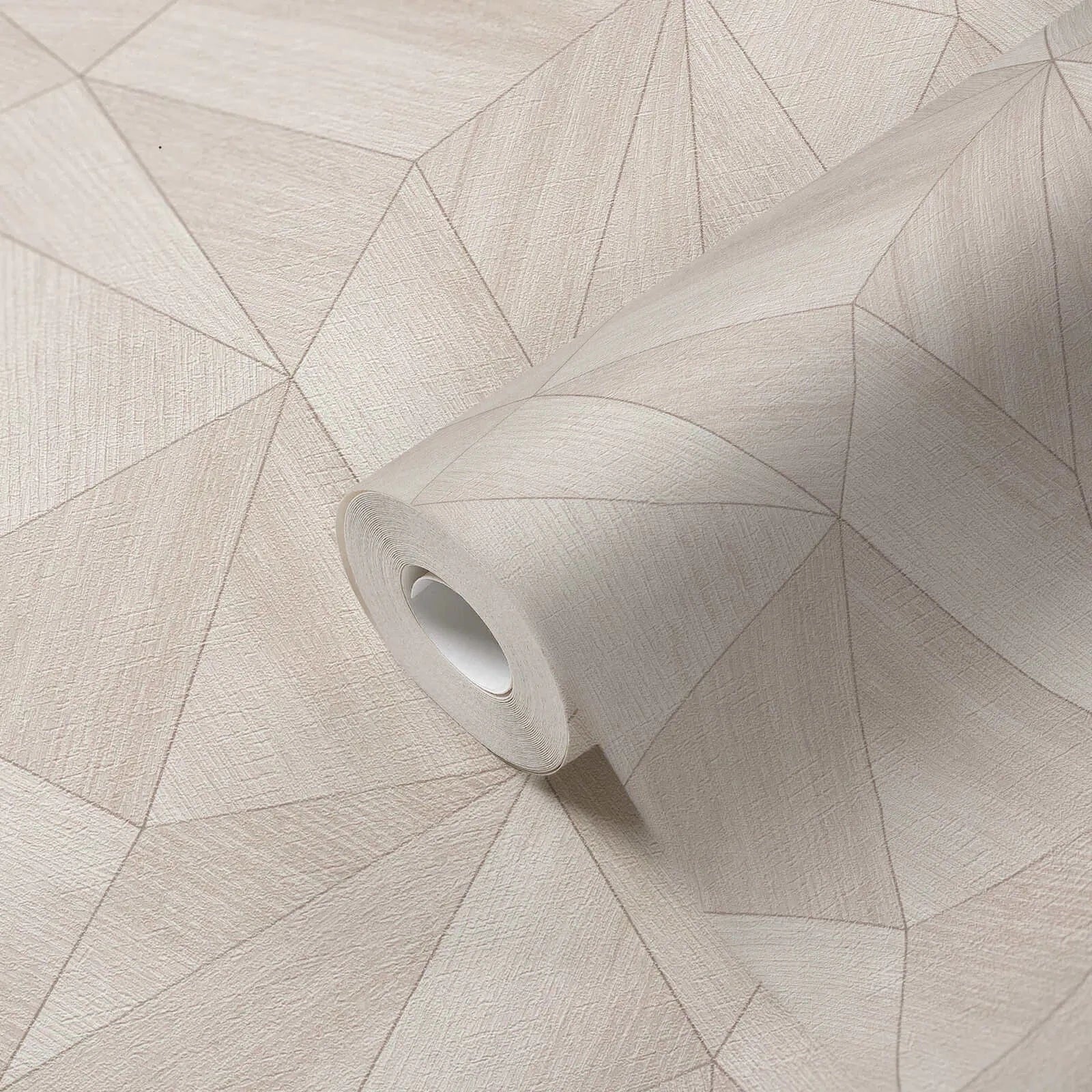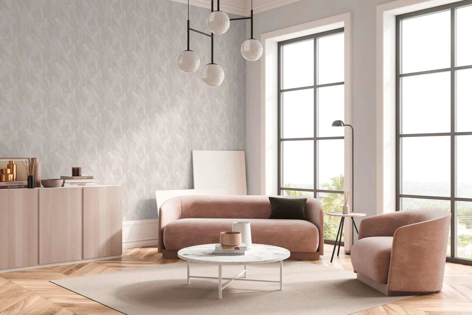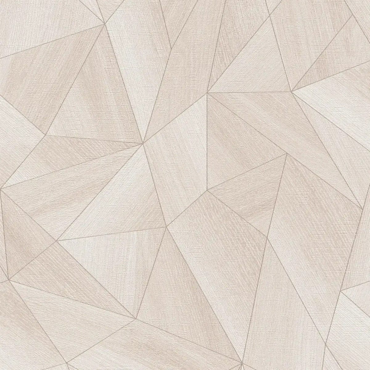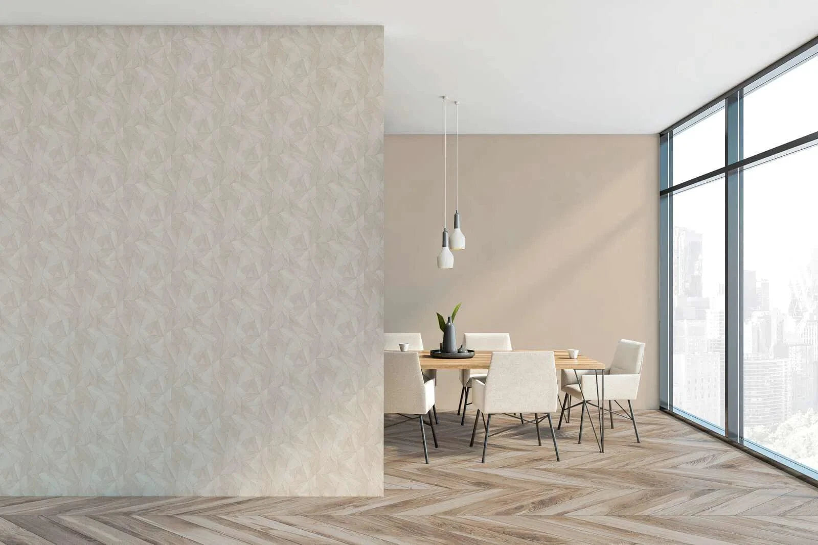 Daniel Hechter bēšas neaustas tapetes ar ģeometrisku rakstu piešķir interjeram siltumu un modernu stilu.
