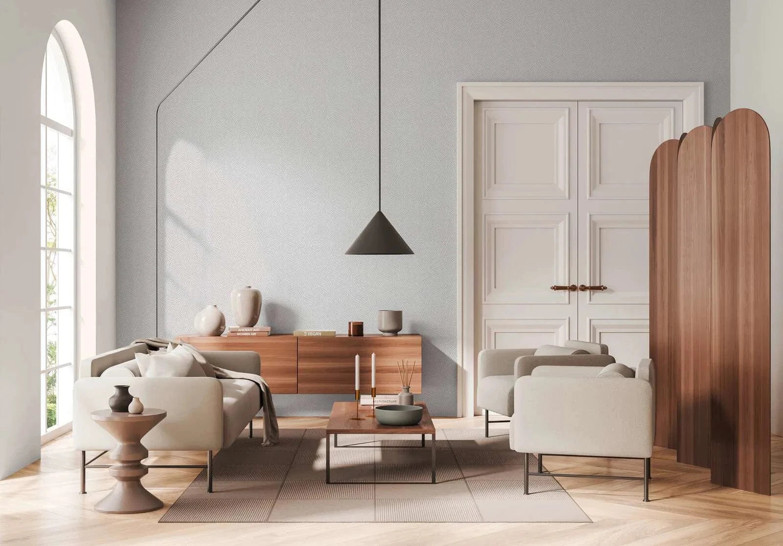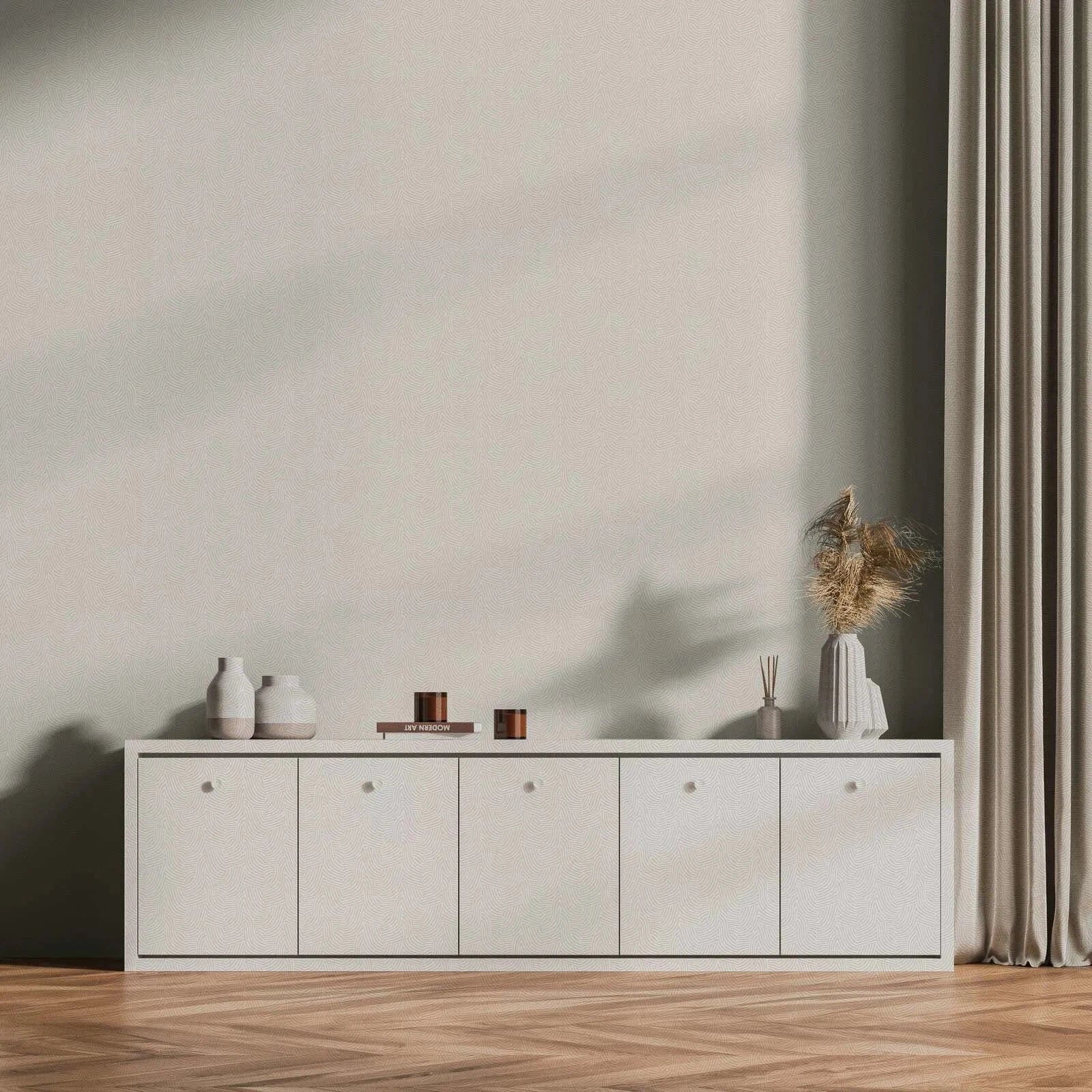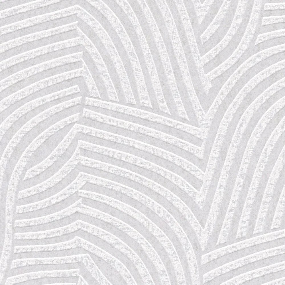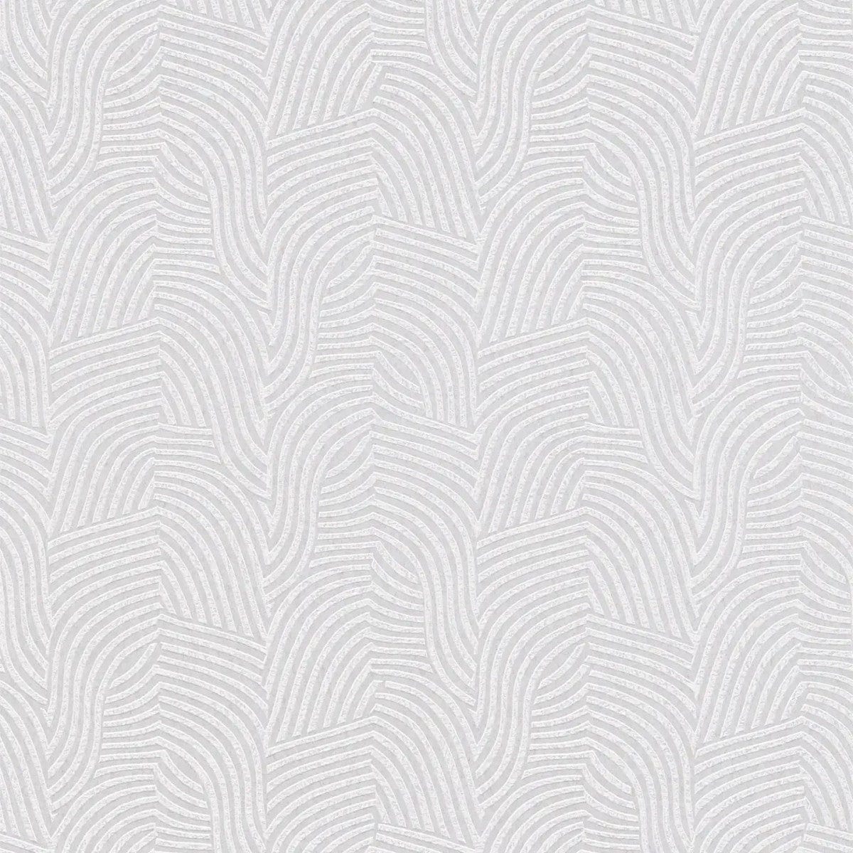 Daniel Hechter baltas un gaiši pelēkas tapetes ar viļņveida līniju rakstu rada dinamisku un elegantu sienas akcentu.