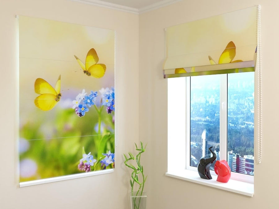 Žalūzijas ar tauriņiem - Zili ziedi un dzelteni tauriņi