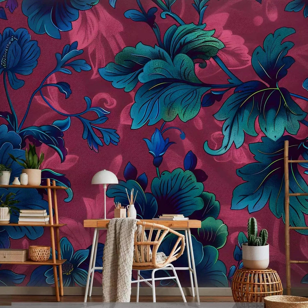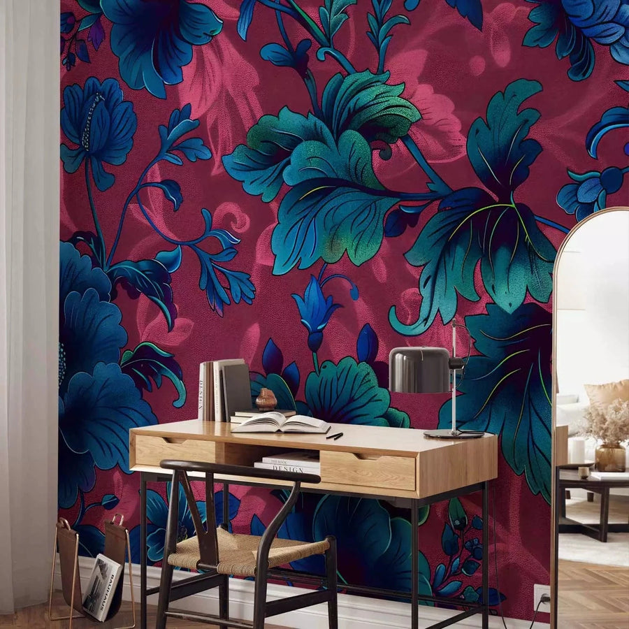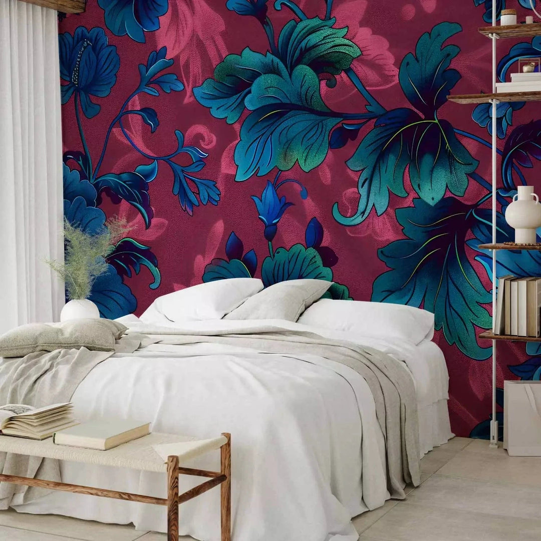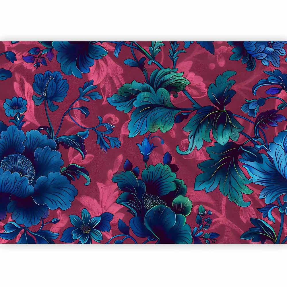 Fototapetes - Zilas puķes - eleganti ziedu motīvi uz bordo fona, 160411