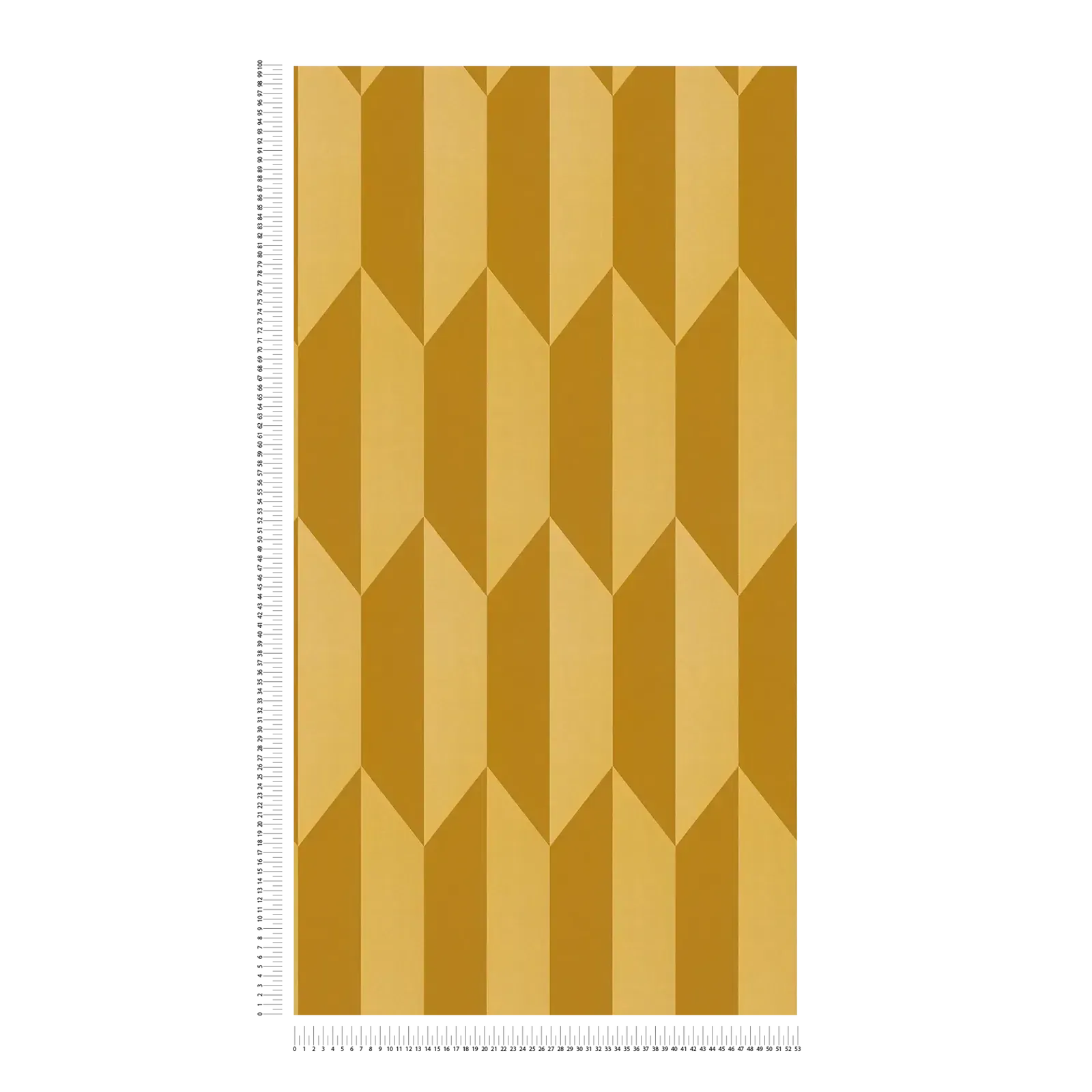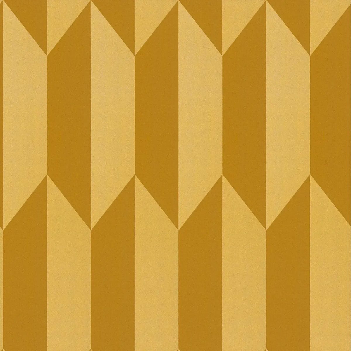 Tapetes motīvs attēlo ģeometrisku rakstu no atkārtojošiem rombiem un paralēlogrammām, kas nevainojami saskaņojas. Tas rada interesantu trīsdimensiju efektu, it kā formas izceļas spilgti no fona. Krāsu gamma raksturojas ar siltām dzeltenām un okera toņiem, kas ir harmoniski saskaņoti. Virsmām ir gaišāks un tumšāks dzeltenokrāsas okers, kas pastiprina grafisko, gandrīz retro rakstu. Tapetes rada draudzīgu, dzīvīgu efektu un telpā veido siltu, aicinošu atmosfēru. Simetrija un skaidras līnijas rada modernu, grafisku stilu ar vintage pieskaņu, kas atgādina vidusgadsimta dizainu.