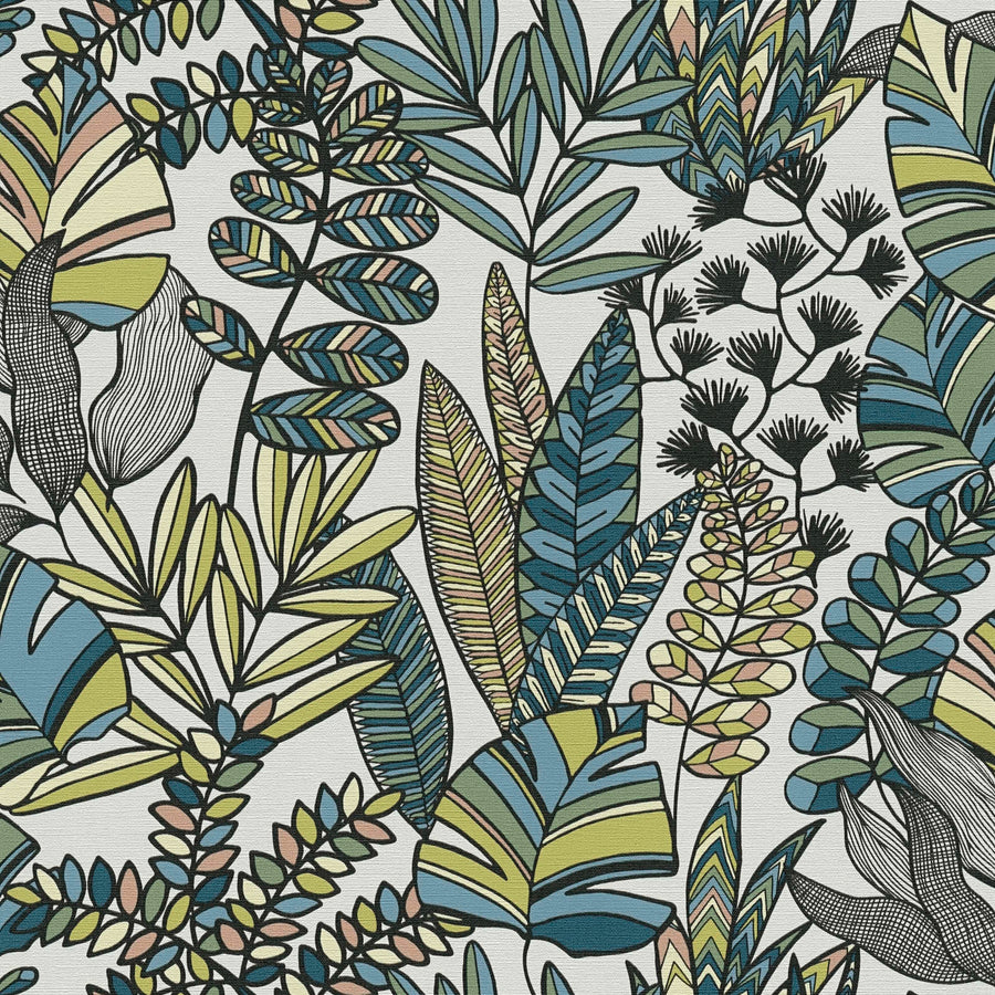 Tapetes ar džungļu rakstu, matētas: tirkīza, zila, zaļa, 393553 AS Creation