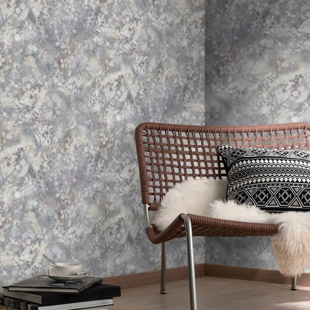 Kantrī stila tapetes ar ziedu rakstu: gaiši zilā un pelēkā krāsā - 1373010