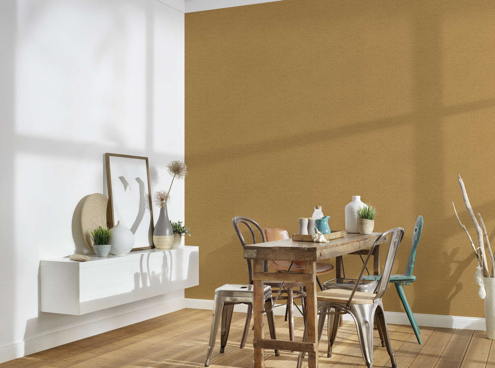 Vienkrāsaina tapete ar auduma struktūru:  dzeltenbrūnā krāsā, 393516 AS Creation