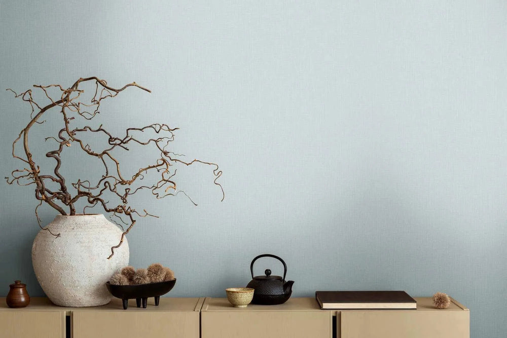 Vienkrāsainas flizelīna tapetes ar auduma izskatu, gaiši zilā krāsā - 1414774