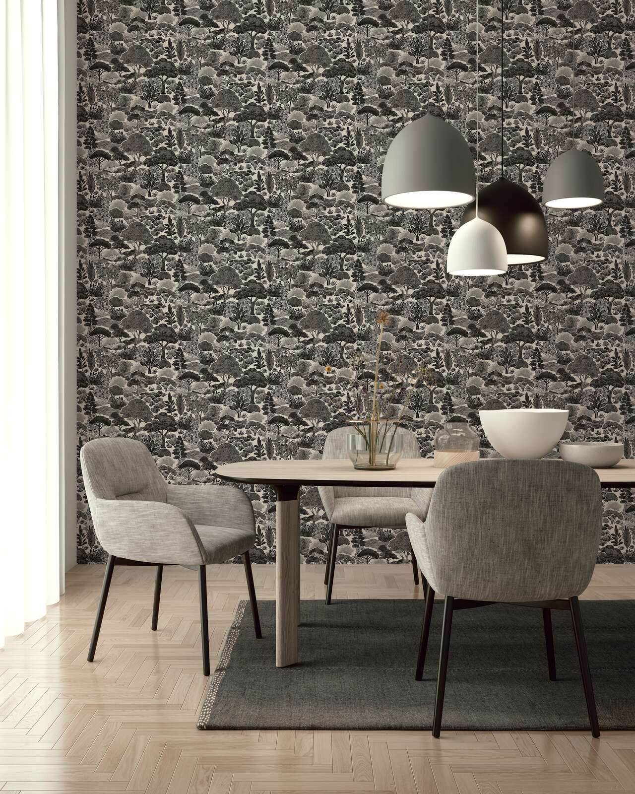 Motīvs attēlo iespaidīgu, lielformāta botānisku rakstu ar stilizētām, gandrīz grafiskām augu un lapu formām. Ilustrācija atgādina koka vai linoleja gravējumu: smalkas, izteiksmīgas līnijas imitē lapu un papardes struktūru un piešķir tapetēm dinamisku faktūru. Centrā redzamas platas augu lapas, kas izkārtotas dažādos izmēros un virzienos un daļēji pārklājas. Krāsu gamma ir monohroma un koncentrējas uz izteiksmīgu kontrastu spēli starp melnu un baltu vai gaiši smilškrāsas toņiem. Šī minimālistiskā krāsu gamma kombinācijā ar rokām veidoto stilu izskatās eleganti un mūžīgi, bet vienlaikus telpai piešķir māksliniecisku, nedaudz izteiksmīgu pieskārienu. Fona tekstūra nedaudz atgādina smalku linu vai audeklu un uzsver dizaina dabisko, nedaudz raupjo raksturu. Raksts rada mierīgu, bet dzīvīgu atmosfēru un ir ideāls, lai padarītu sienu par acu piesaisti, neuzbāžoties.