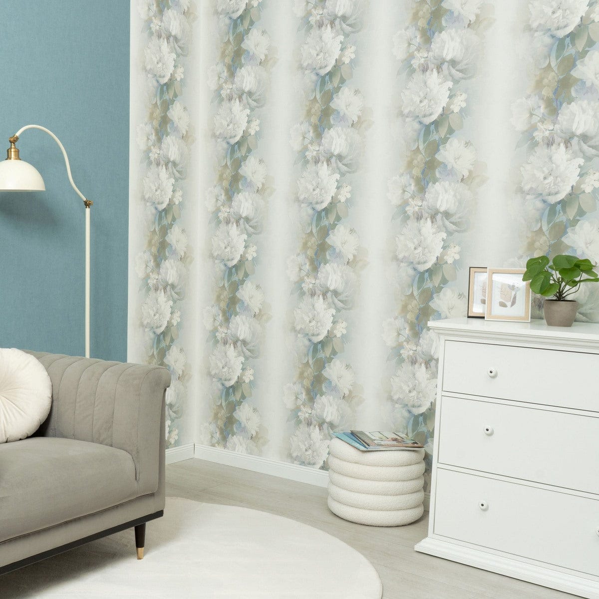 Dabas svaigums. Zaļo, zilo un balto toņu kombinācija ziedu rakstā atgādina pavasara pļavu. Matētā apdare pastiprina dabiskuma sajūtu.