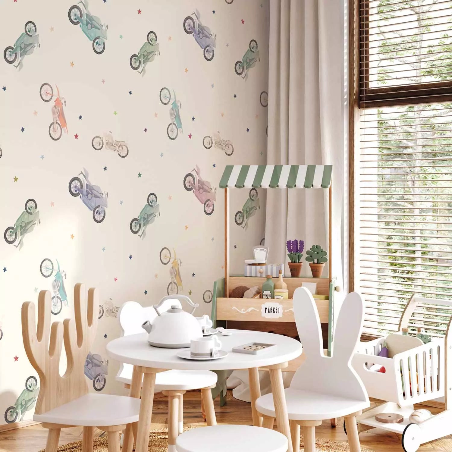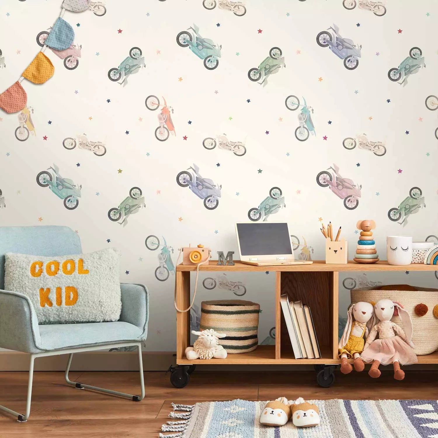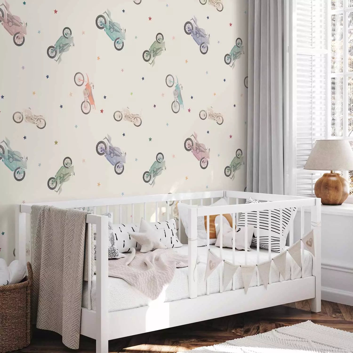 Fototapetes - Krāsaini motocikli un zvaigznes uz gaiša fona, 149202