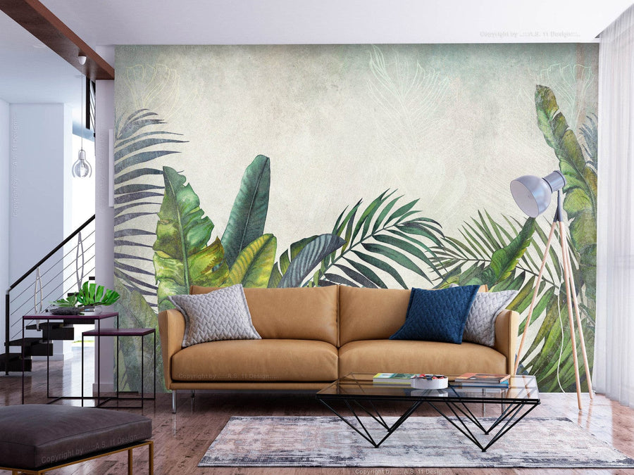 Fototapetes zaļos toņos ar tropiskām lapām- Savvaļas siena - 142994 G-ART