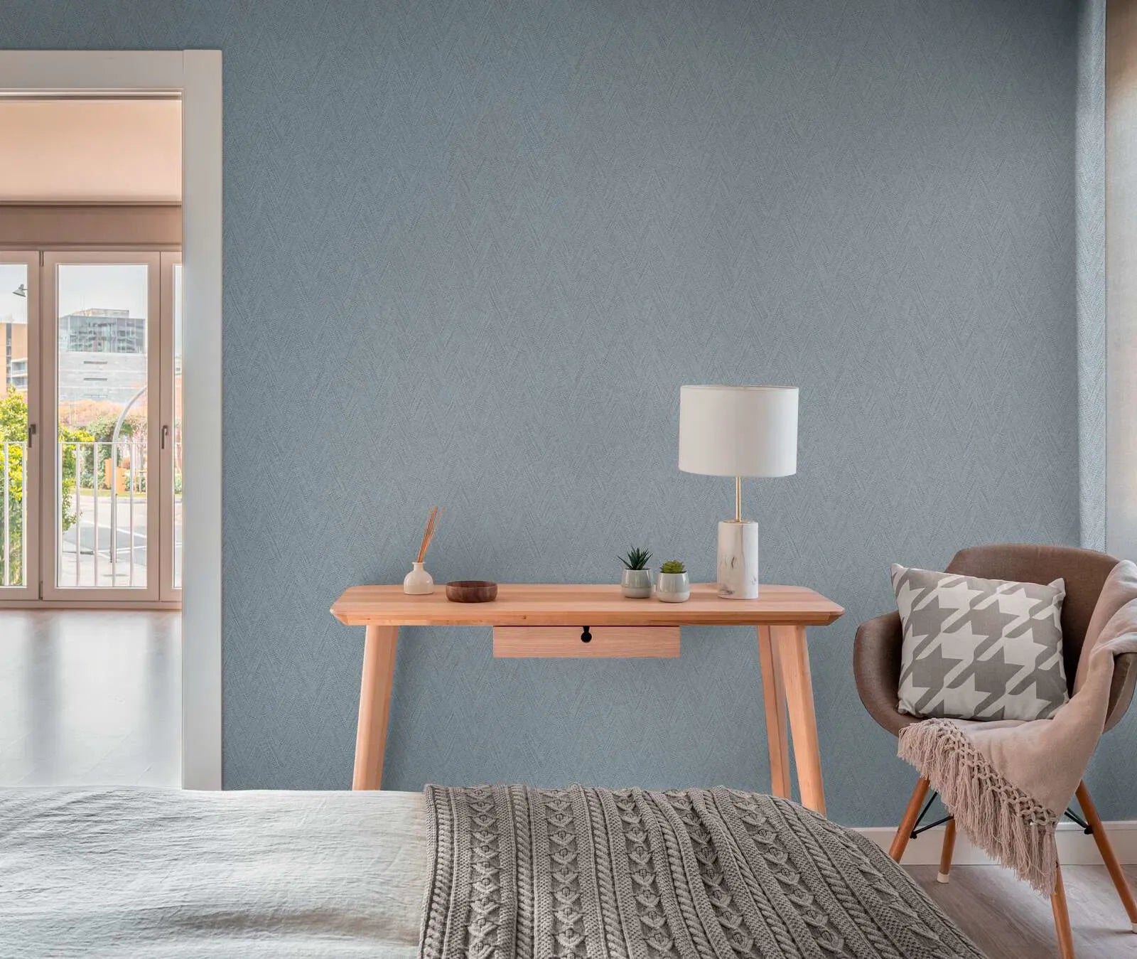 Tapetes motīvs attēlo smalku zigzaga rakstu, ko veido blīvi izvietotas, nedaudz neregulāras līnijas. Lineārā struktūra izskatās gandrīz kā austs audums un piešķir virsmai patīkamu faktūru. Krāsu gamma ir pārsvarā vēsajos pelēkā un zilā toņos, ar smalkām gaiši pelēkā un gaiši zilā toņu niansēm, kas saplūst kopā. Kopējais iespaids ir mierīgs, moderns un atturīgs. Strukturētais raksts rada smalku dinamiku, kas piešķir telpai dziļumu, neuzbāzoties. Dizains ir atturīgs un mūžīgs, perfekti saderas ar minimālisma vai skandināvu dzīves stilu un rada patīkamu, līdzsvarotu atmosfēru.