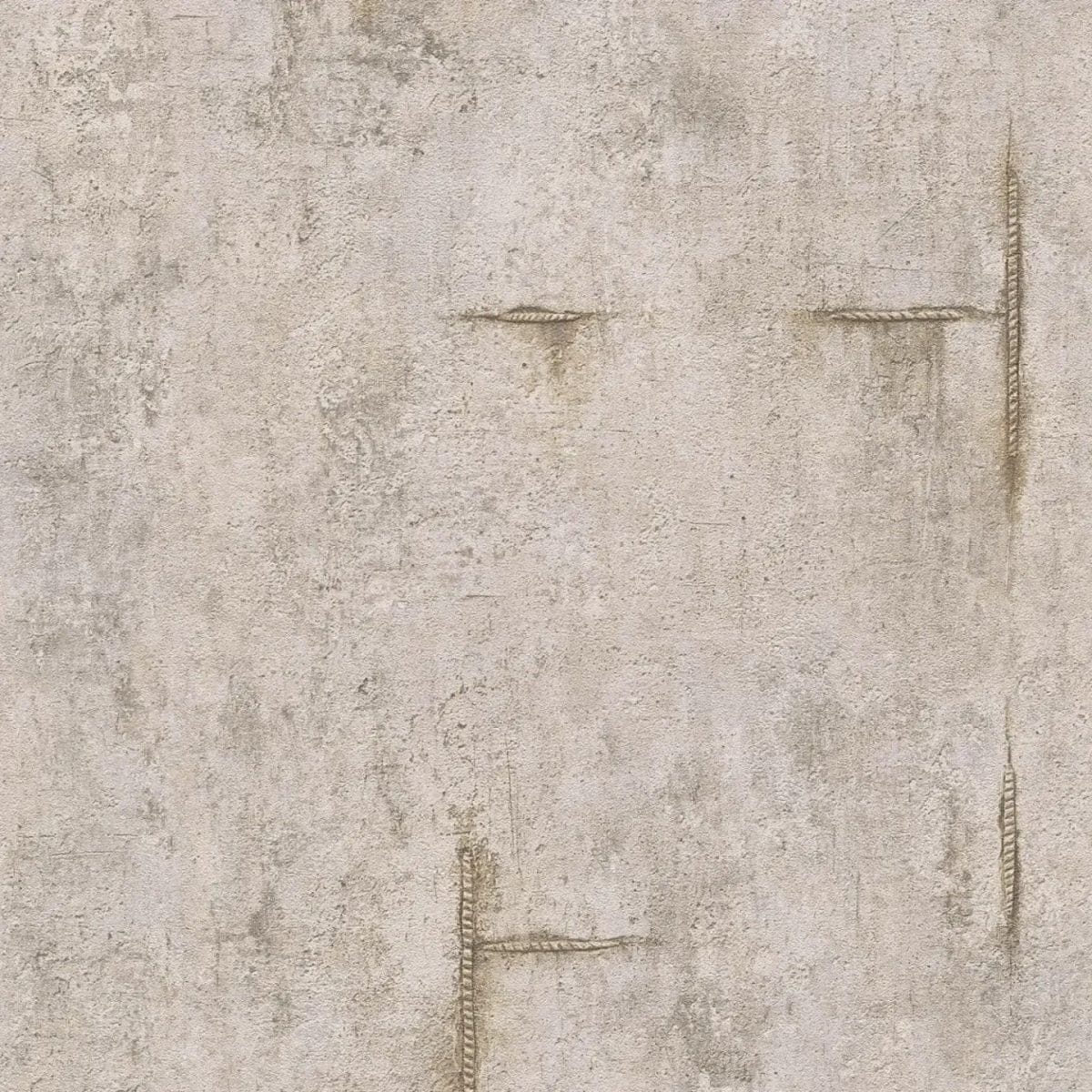 Tapetes motīvs attēlo rupji teksturētu, betona līdzīgu virsmu maigos smilškrāsas un pelēkos toņos, kas mijas ar smalkām pelēkā un gaiši brūnā toņu niansēm. Krāsu gamma ir neitrāla un atturīga, radot mierīgu un neuzbāzīgu atmosfēru. Iekļautās horizontālās un vertikālās līnijas, kas atgādina gravētus tērauda trošu vai stiegrojuma stieņus, ir izteiksmīgas un piešķir smalku industriālu šarmu. Līnijas ir savstarpēji perpendikulāras un izskatās daļēji izbalējušas, it kā tās būtu celtniecības objektu vai vecas industriālās arhitektūras pēdas. Kopumā raksts izskatās raupjš un autentisks, bet gaiši pelēkā un smilškrāsā pamatkrāsa rada patīkamu viegluma sajūtu. Ideāli piemērots modernām, urbānām telpu koncepcijām ar loftu raksturu, kurās tiek meklēts strukturēts, bet mājīgs sienu dizains.