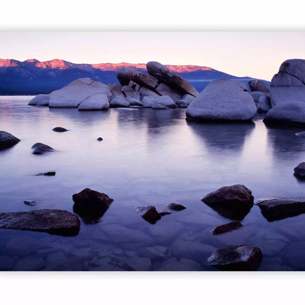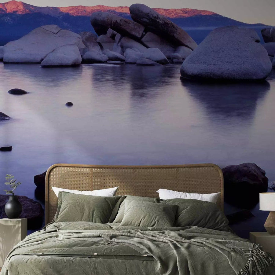 Fototapetes ar lieliem akmeņiem ezera vidū saulrietā, daba un ūdens G-ART