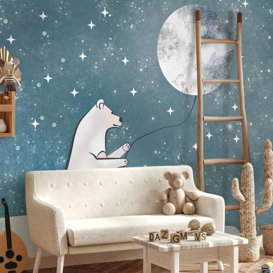 Wall Murals for children - white bear in the shape of a balloon moon on a blue background - 142988