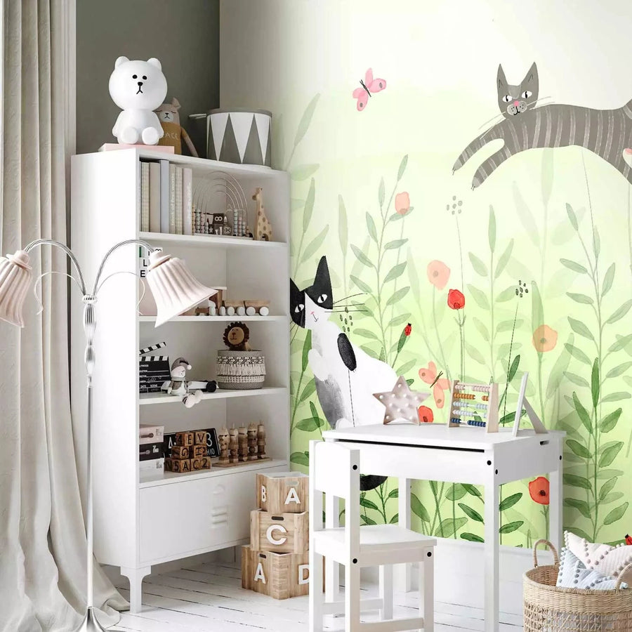 Fototapetes bērnistabai zaļos toņos - Kaķi pļavā ar tauriņiem G-ART