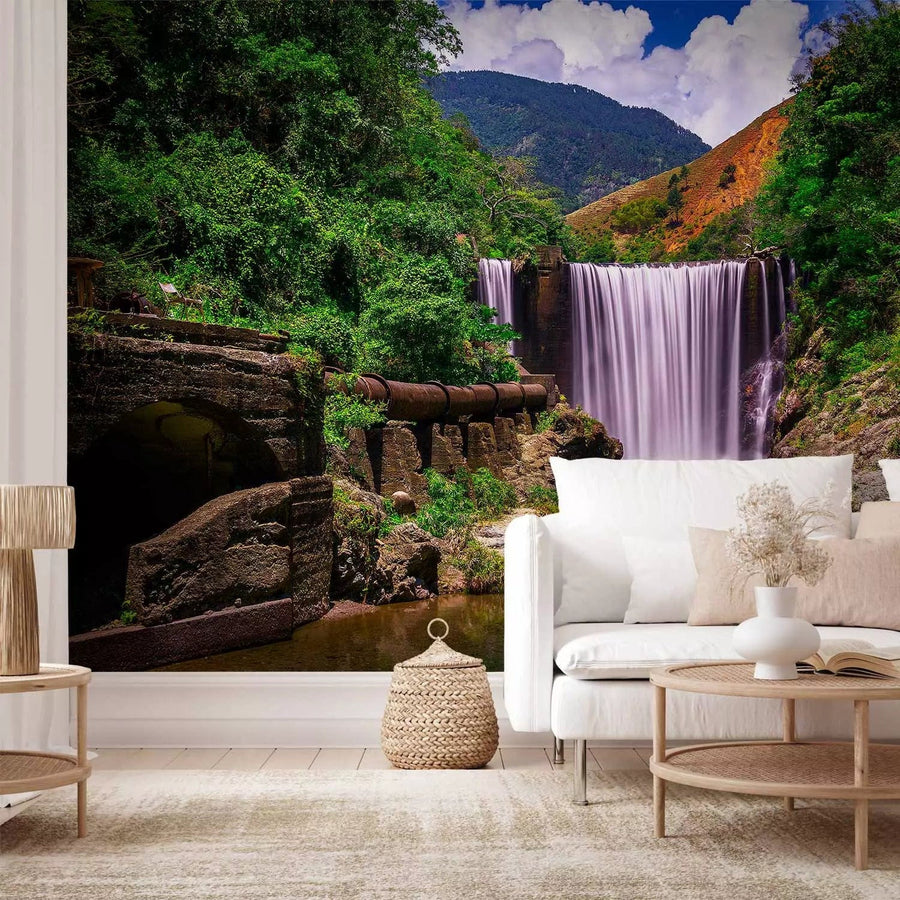 Fototapetes - ūdenskritumi kalnos starp zaļiem augiem ar mākoņiem G-ART