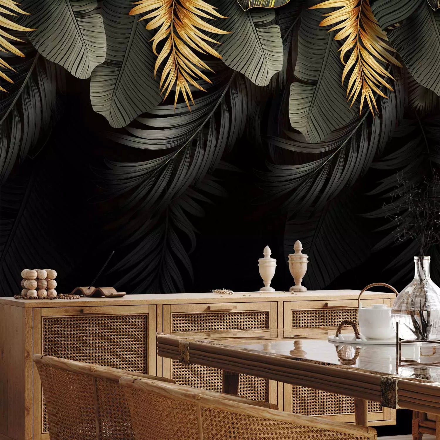 Wall murals - Tropical leaves in green and gold tones, 142318