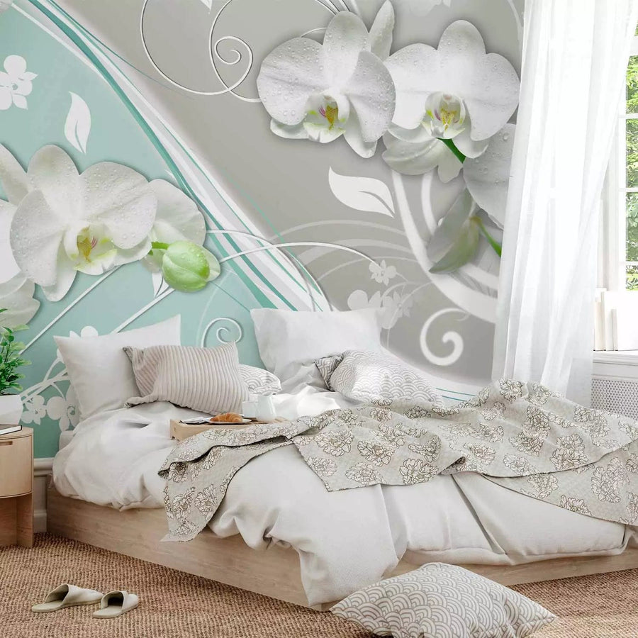 Fototapetes guamistabai ar baltām orhidejām uz pelēka uz zila fona G-ART