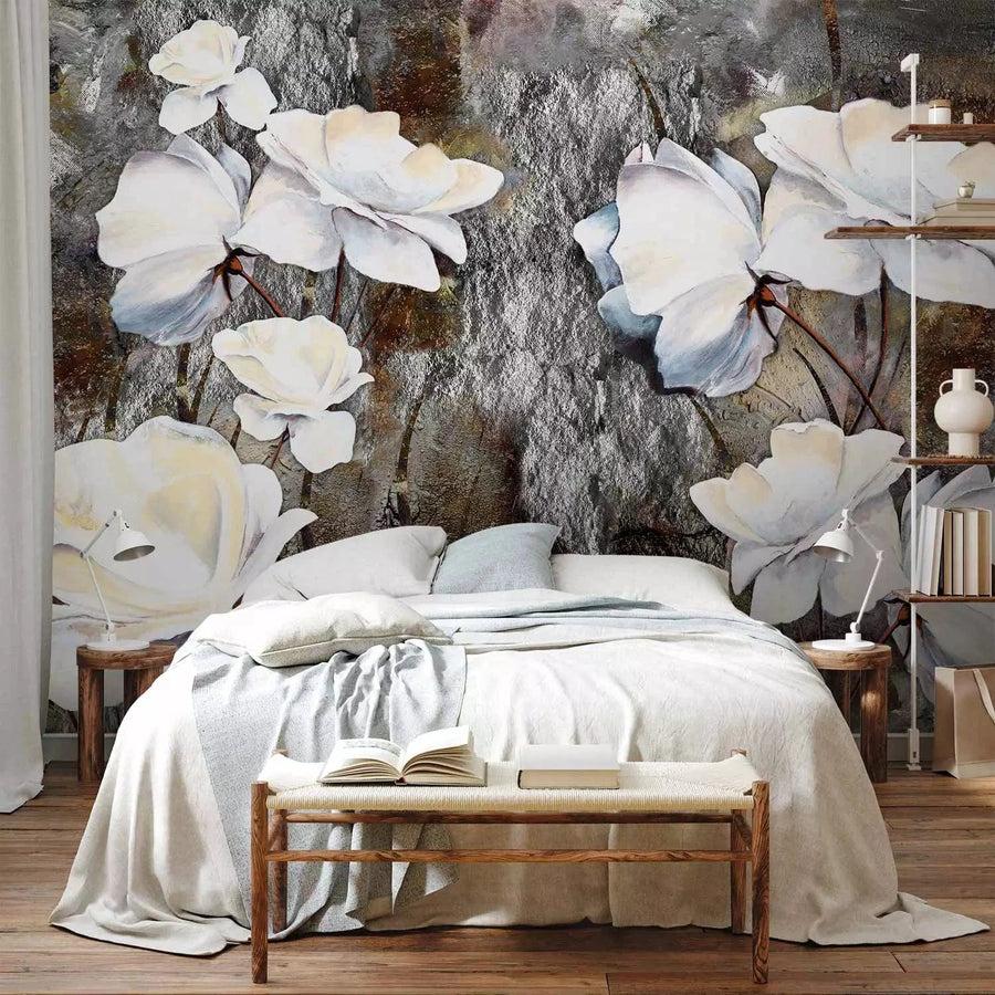 Fototapetes - Baltas dārza lilijas uz pelēka fona guļamistabai G-ART