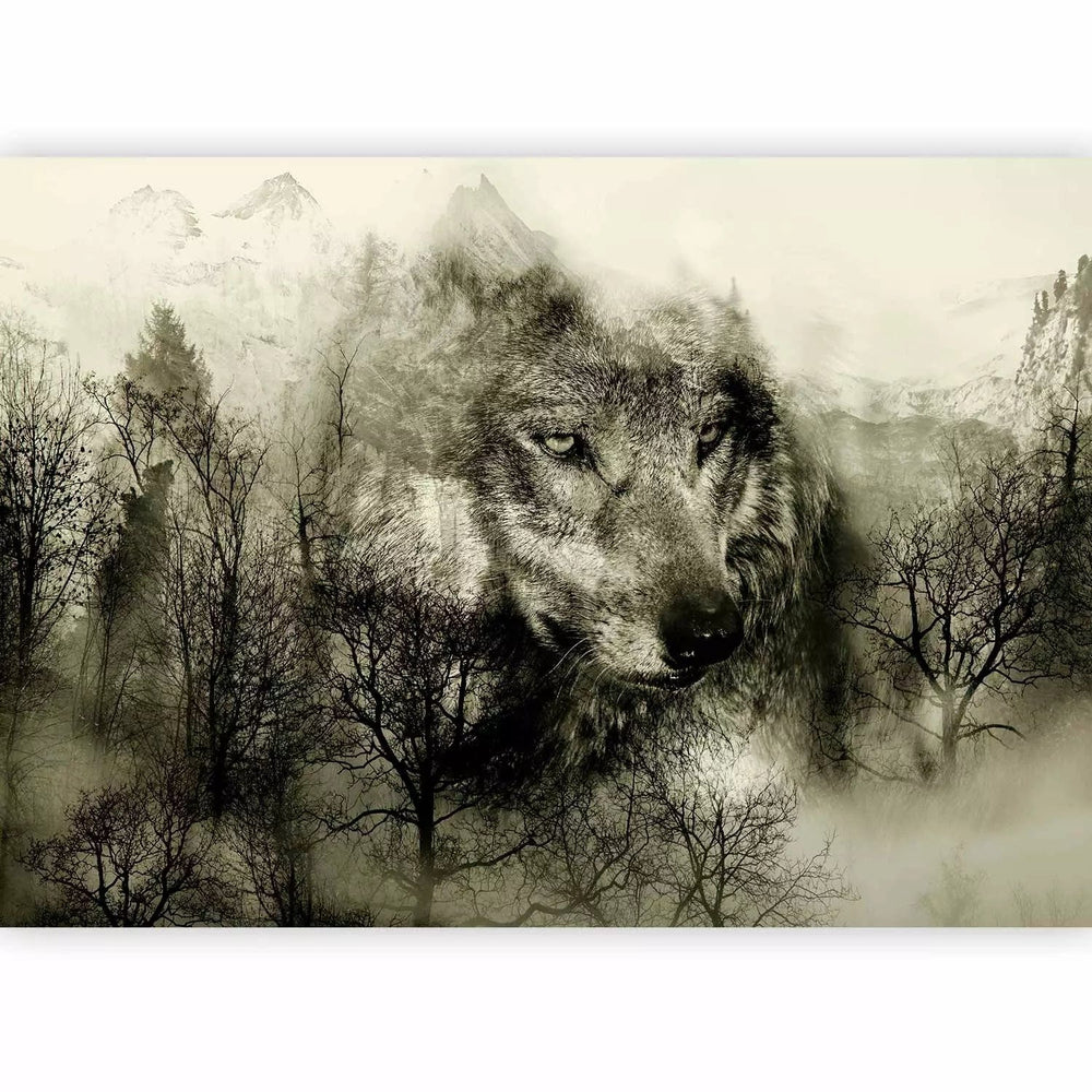Fototapetes - vilks starp meža kokiem kalnos pelēkā krāsā - 108230 G-ART
