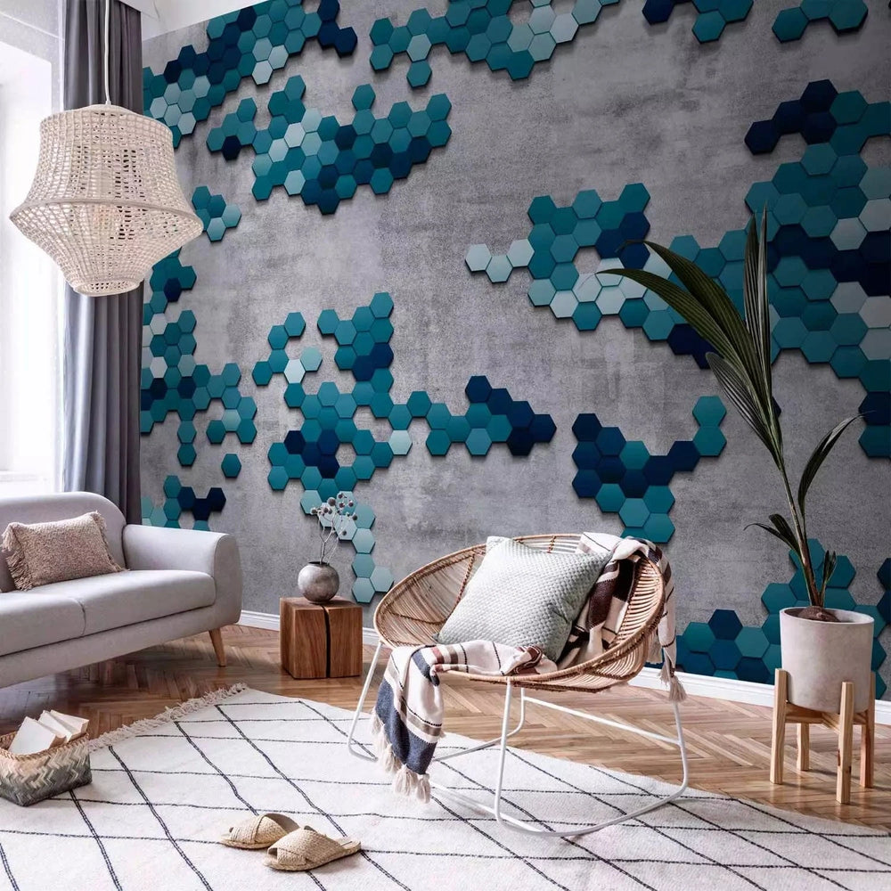 Wall Murals - blue hexagons on grey concrete background, 97651
