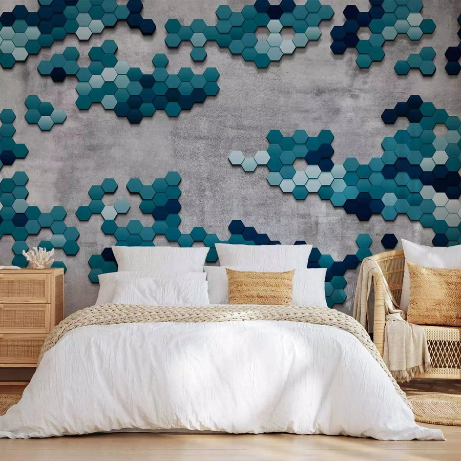 Fototapetes - zili sešstūri uz pelēka betona fona - guļamistabai G-ART