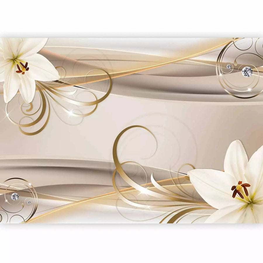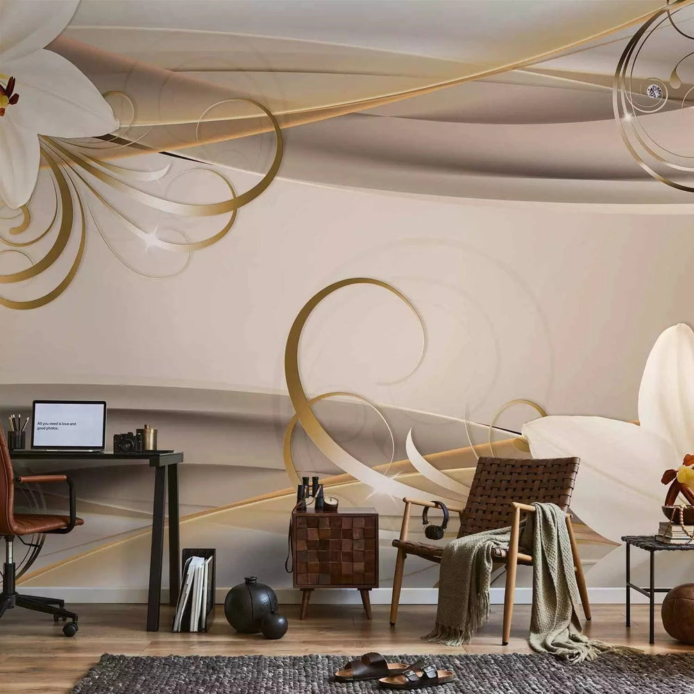 Fototapetes - baltas lilijas ar zelta spirālēm uz bēša fona - cena G-ART