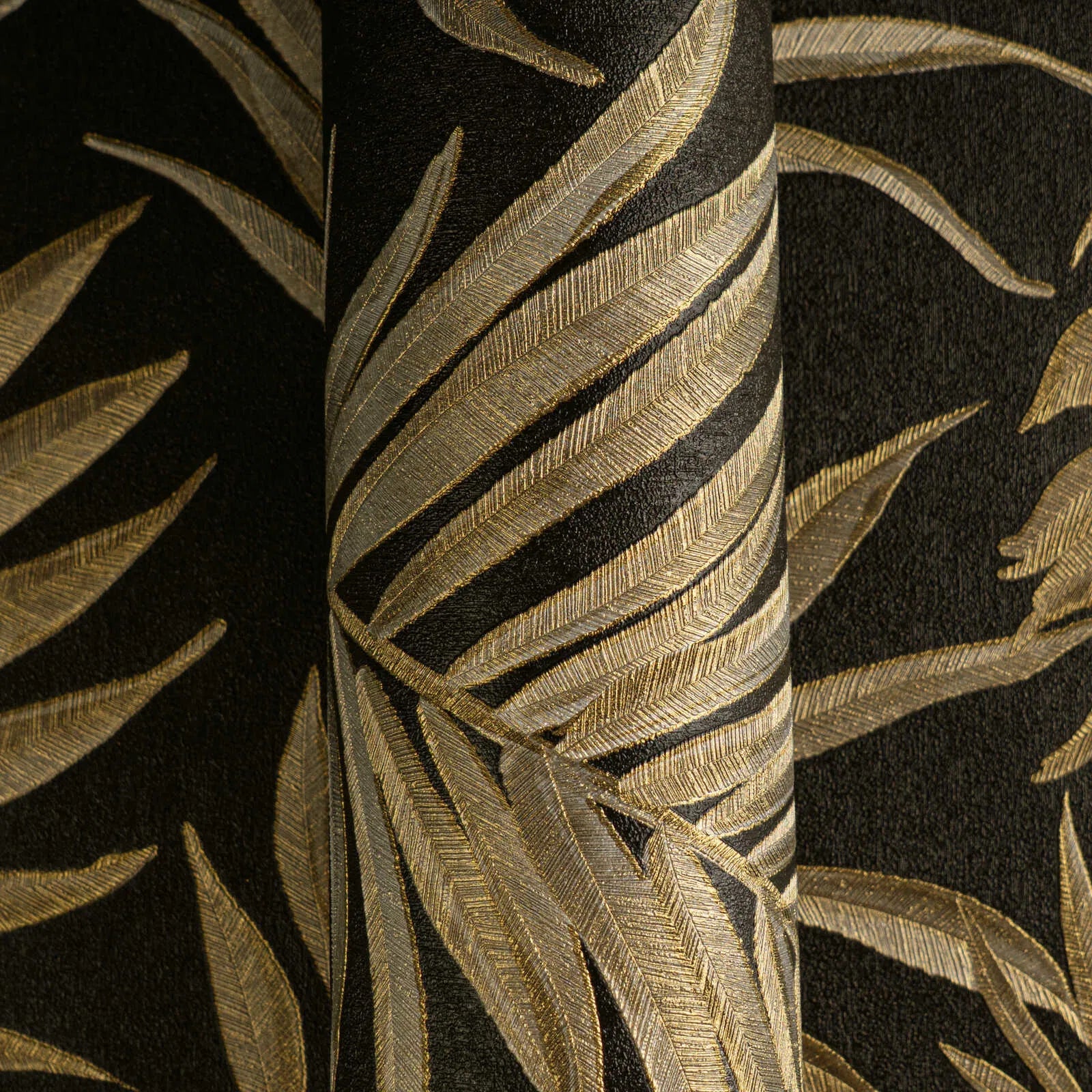 A luxurious wallpaper pattern with a botanical motif featuring golden, delicately drawn palm leaves on a deep black background. The leaves are arranged in different sizes and directions, creating a dynamic, slightly playful but elegant composition. The gold shimmers slightly and contrasts with the matt black background, giving the pattern a luxurious, sophisticated effect. The style is reminiscent of Art Deco with a modern touch: the geometric clarity is interrupted by the natural shape of the leaves. The colour palette adds a warm, almost glam accent and gives the room an exclusive, stylish atmosphere.