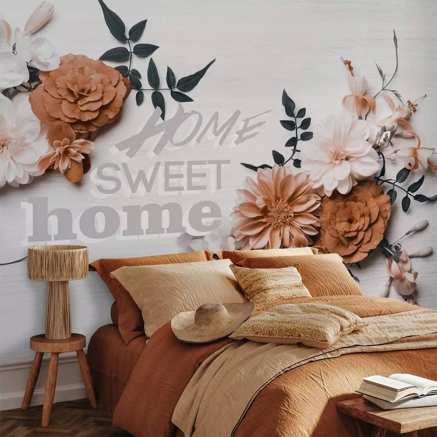 Fototapetes brūnos toņos ar ziediem un uzrakstu "Home sweet home" G-ART