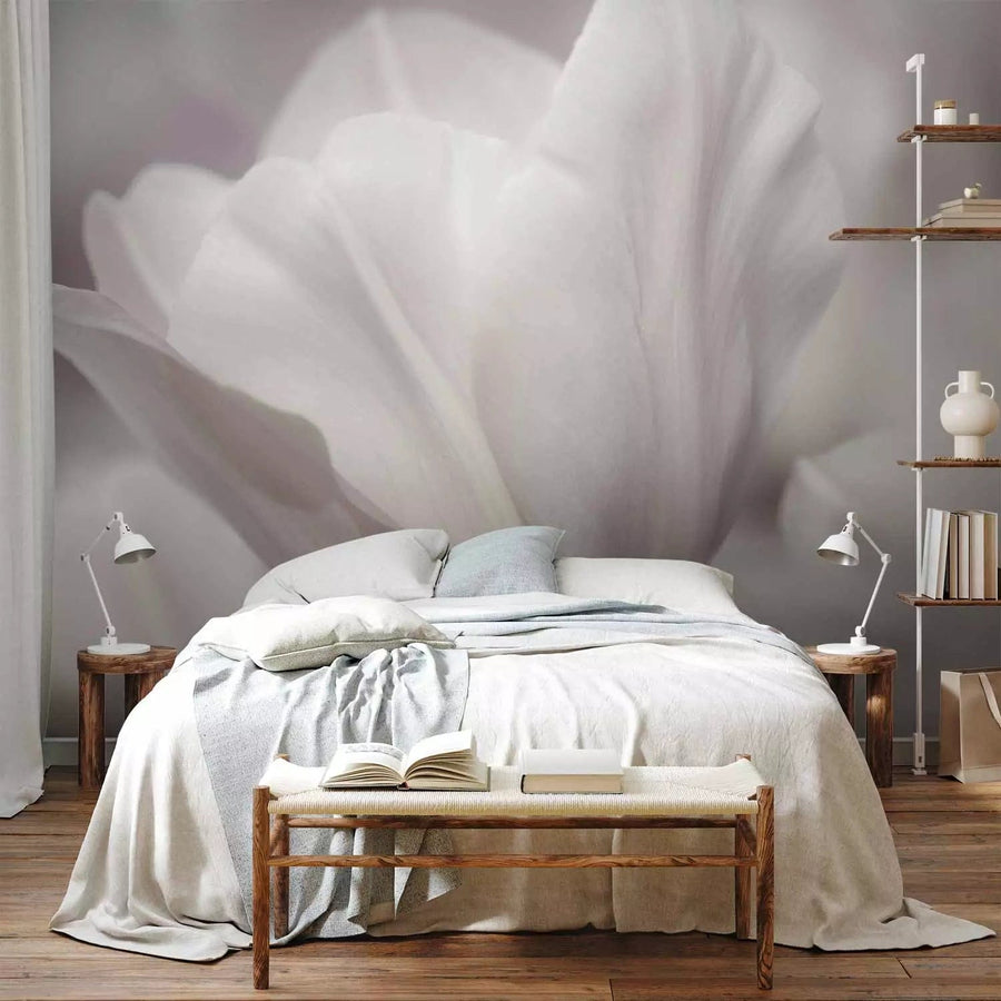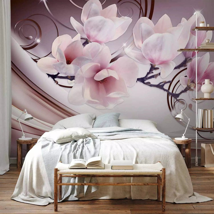 Fototapetes ar ziediem guļamistabas interjerā. Maigi rozā toņos G-ART