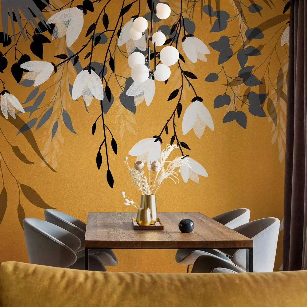 Fototapetes ar zīmētiem ziediem uz oranža fona - Dienas enerģija G-ART