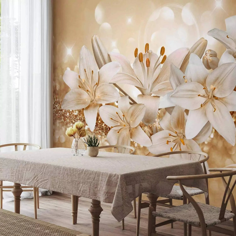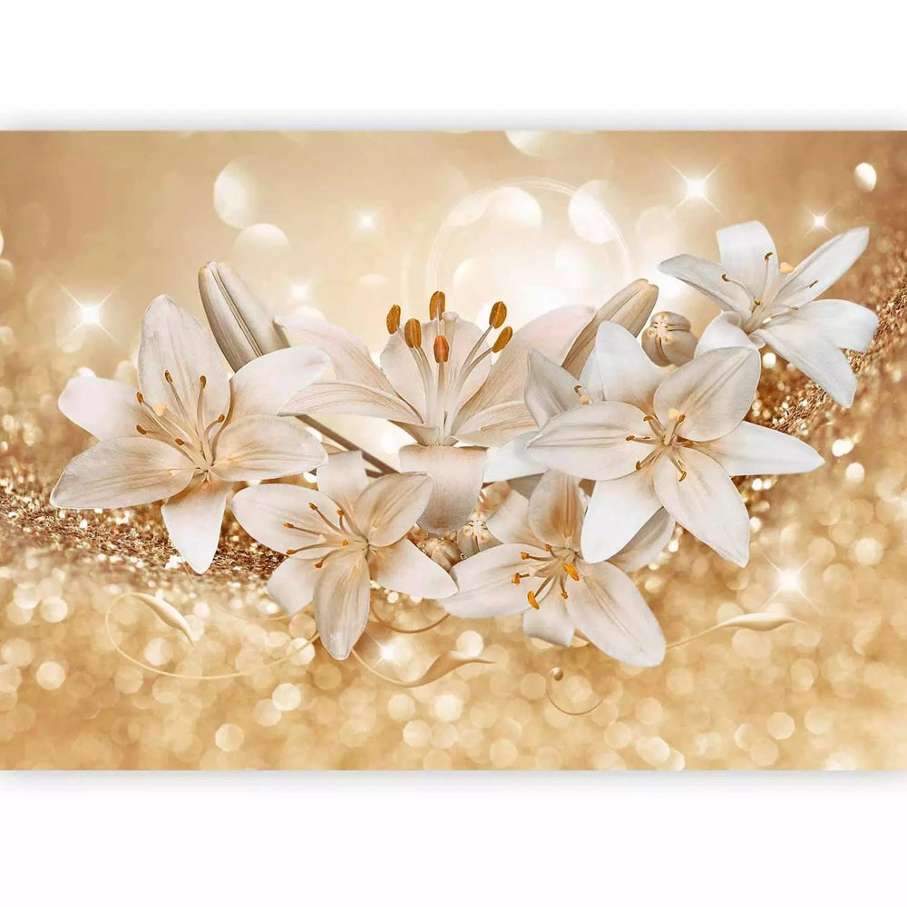 Fototapetes - baltas lilijas uz mirdzoša zelta fona - ekoloģiskas G-ART