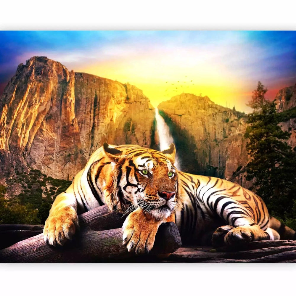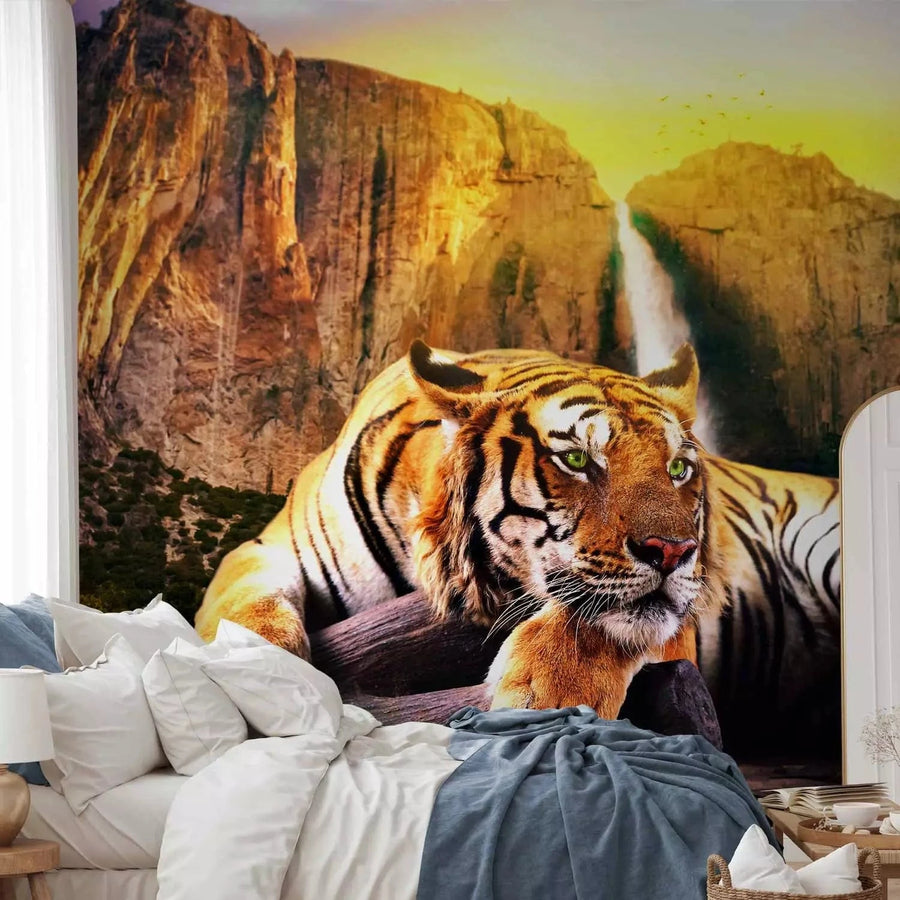 Fototapetes - skaists tīģeris guļ uz klintīm pie ūdenskrituma G-ART