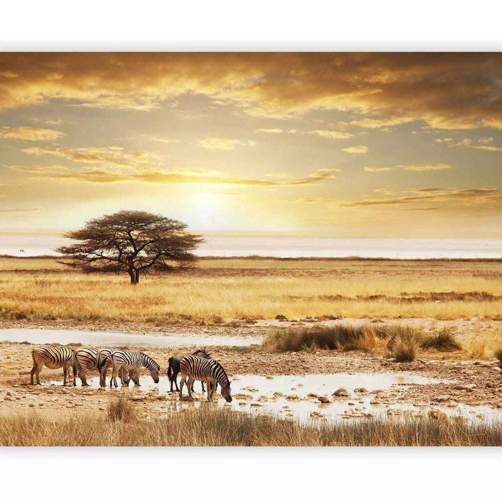 Fototapetes - Saullēkts Āfrikā - zebras savannā pie koku ūdenstilpnes G-ART