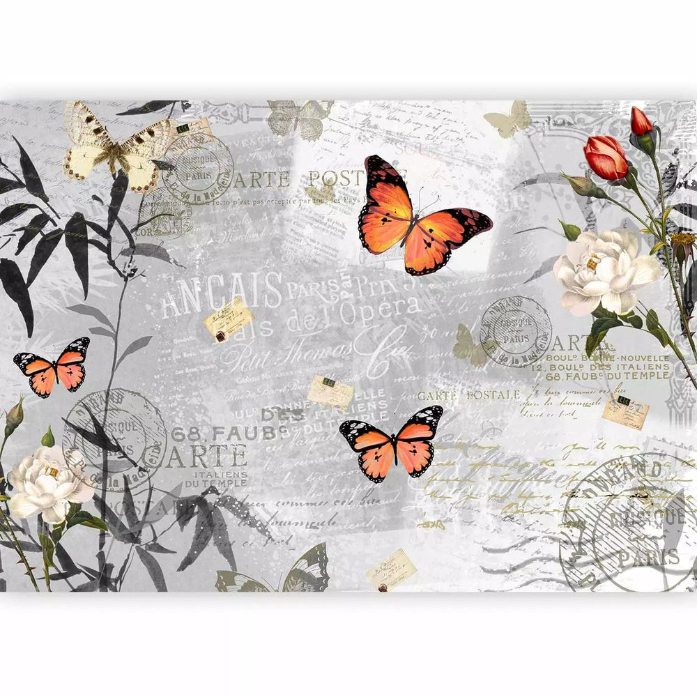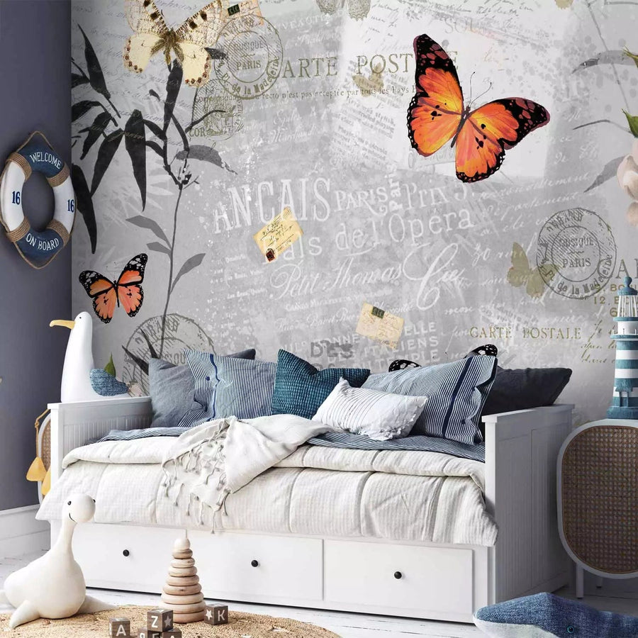 Fototapetes - Tauriņi uz pelēka un balta fona ar uzrakstiem un ziediem G-ART