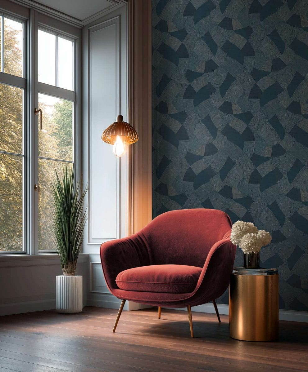 Luxurious wallpaper with a deep tone and a slight sheen. High wear resistance allows it to be cleaned with a brush and soapy water, preserving the freshness of the color. Pattern matching (64 cm) is simple and ensures a flowing design. The dark blue color combined with the geometric line pattern creates an exclusive and calming atmosphere. The circular segments and line graphics on a dark background stand out with a subtle sheen, reminiscent of Art Deco elegance. The ideal choice for a bedroom or living room to create an intimate and stylish environment.