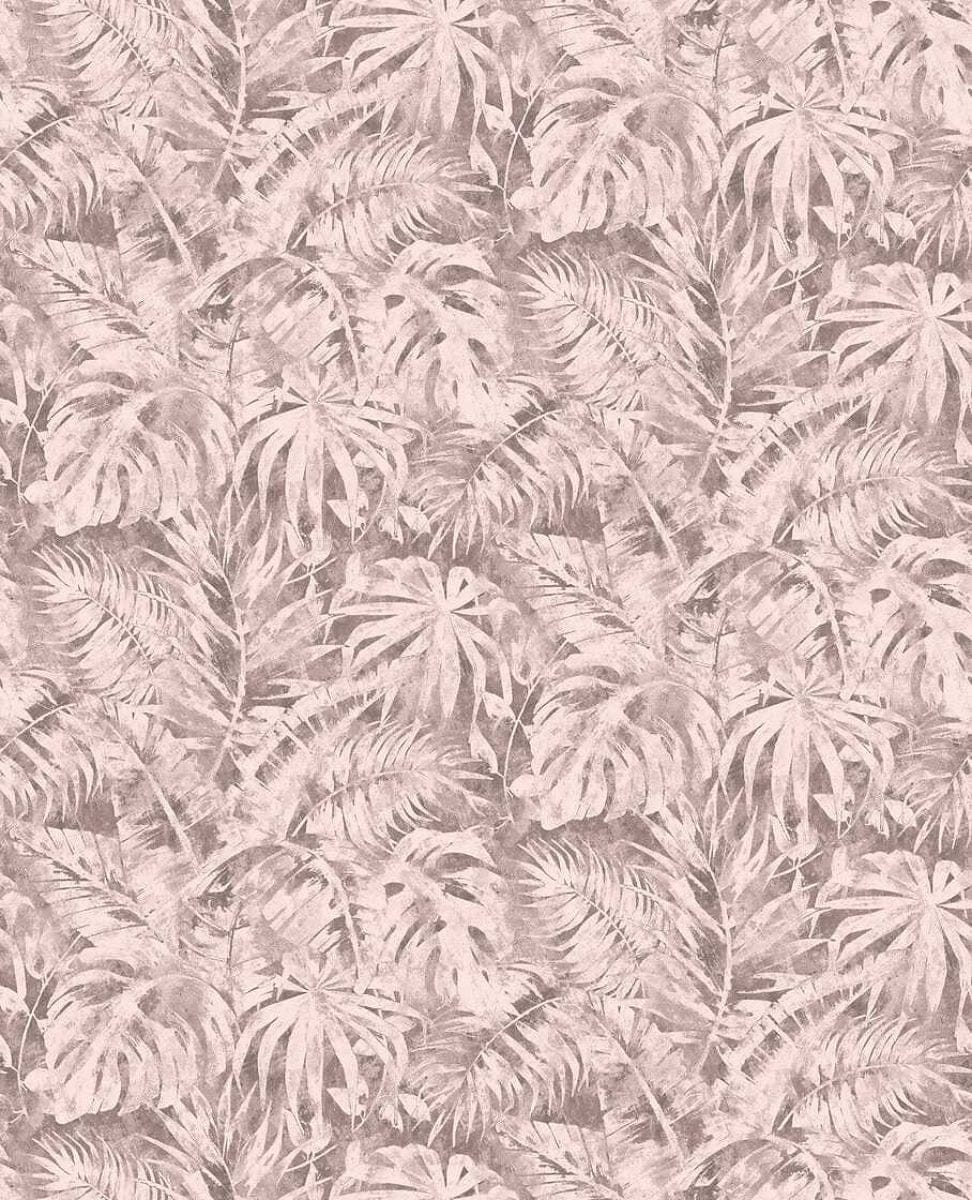 The motif depicts a colourful leaf pattern consisting of various tropical plants, such as monstera and palm leaves, spread evenly over the entire surface. The leaves are designed as a filigree pattern with many fine details and overlays, which together create a lively but harmonious effect. The colour palette is delicate, in shades of powdery grey-brown and pink, giving the pattern a restrained, almost monochrome character. It creates a subtle, elegant atmosphere with a vintage charm. The interplay of tropical leaves and soft colours creates a calm, relaxed effect and makes the room feel cosy and modern.
