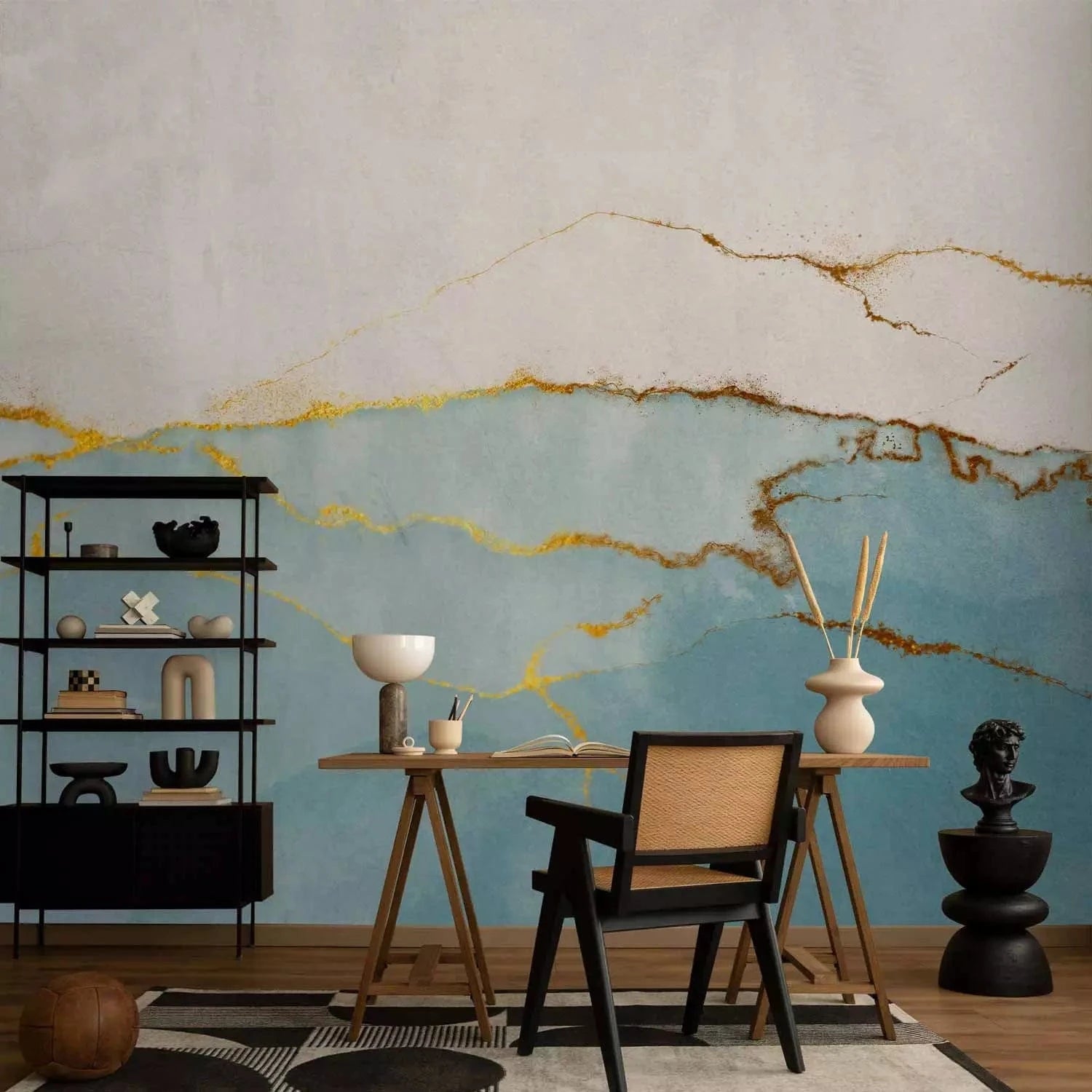 Wall Murals with an abstract texture in blue with gold elements, 143586