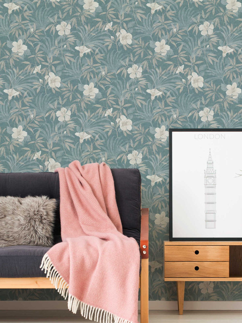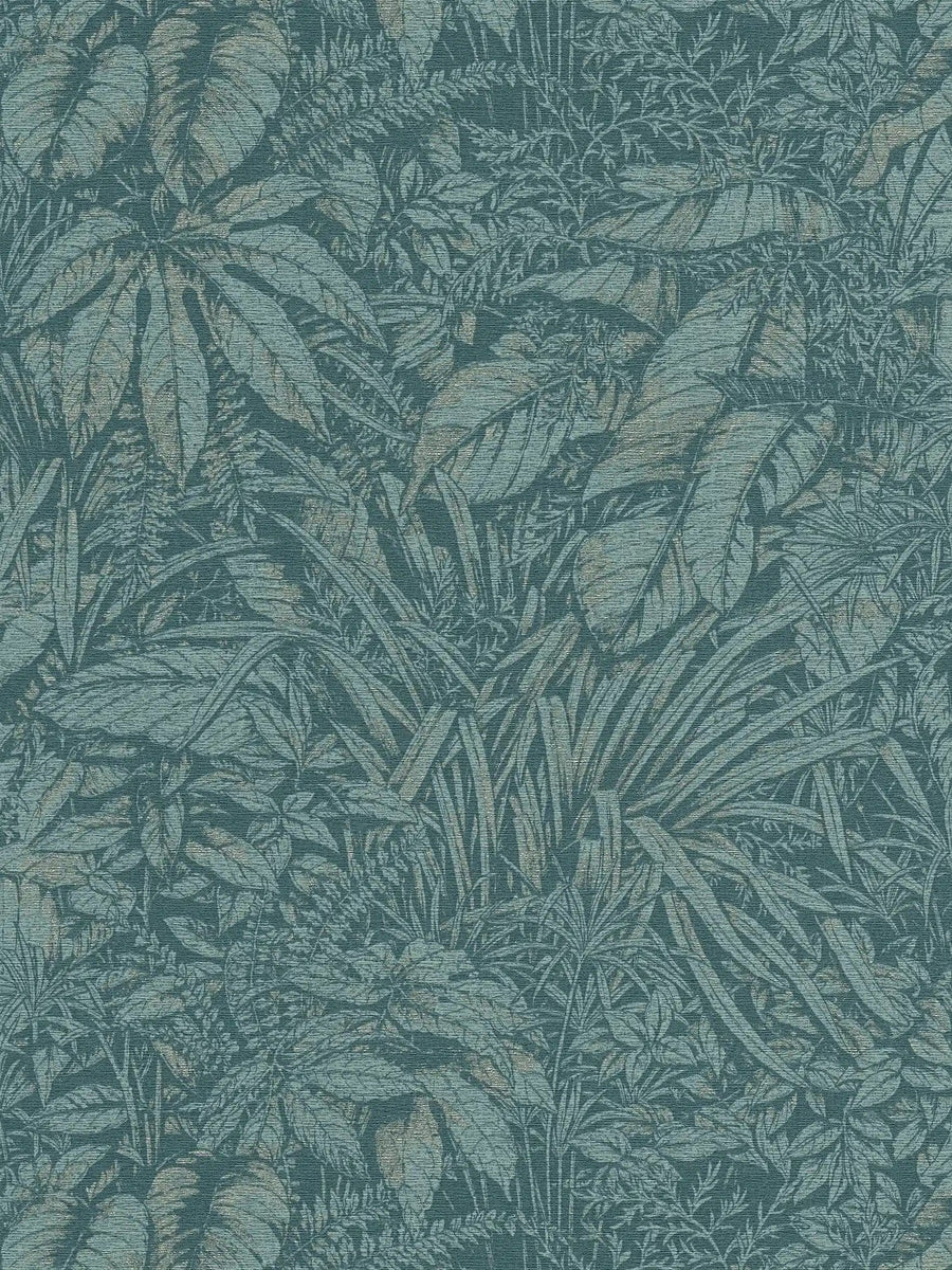 Tapetes viesistabai ar palmu lapu rakstu zilā krāsā, AS 395603 AS Creation