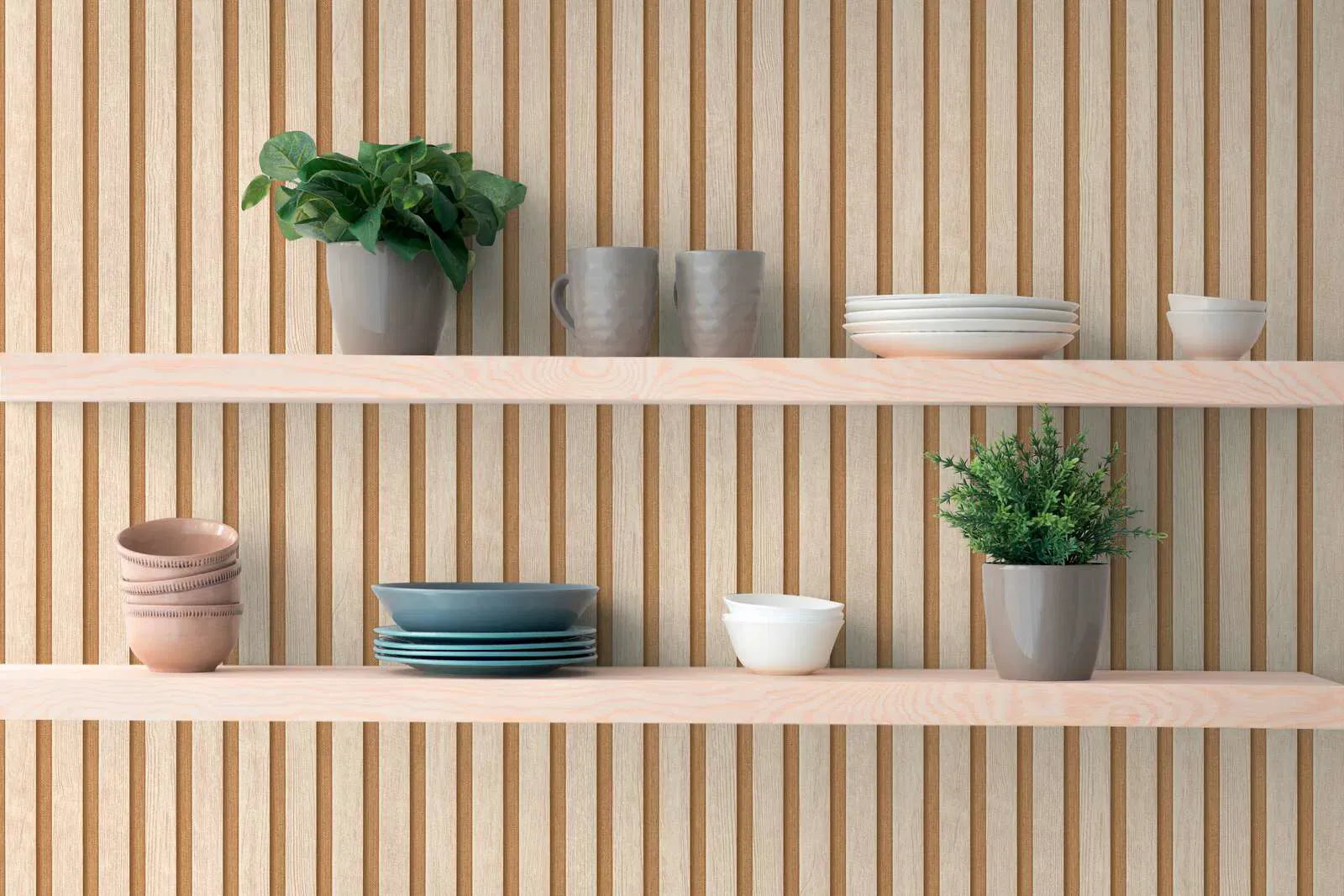 Striped wood-effect wallpaper in beige (3000334). Slightly glossy surface for a natural and elegant effect. Ideal for cozy interiors.